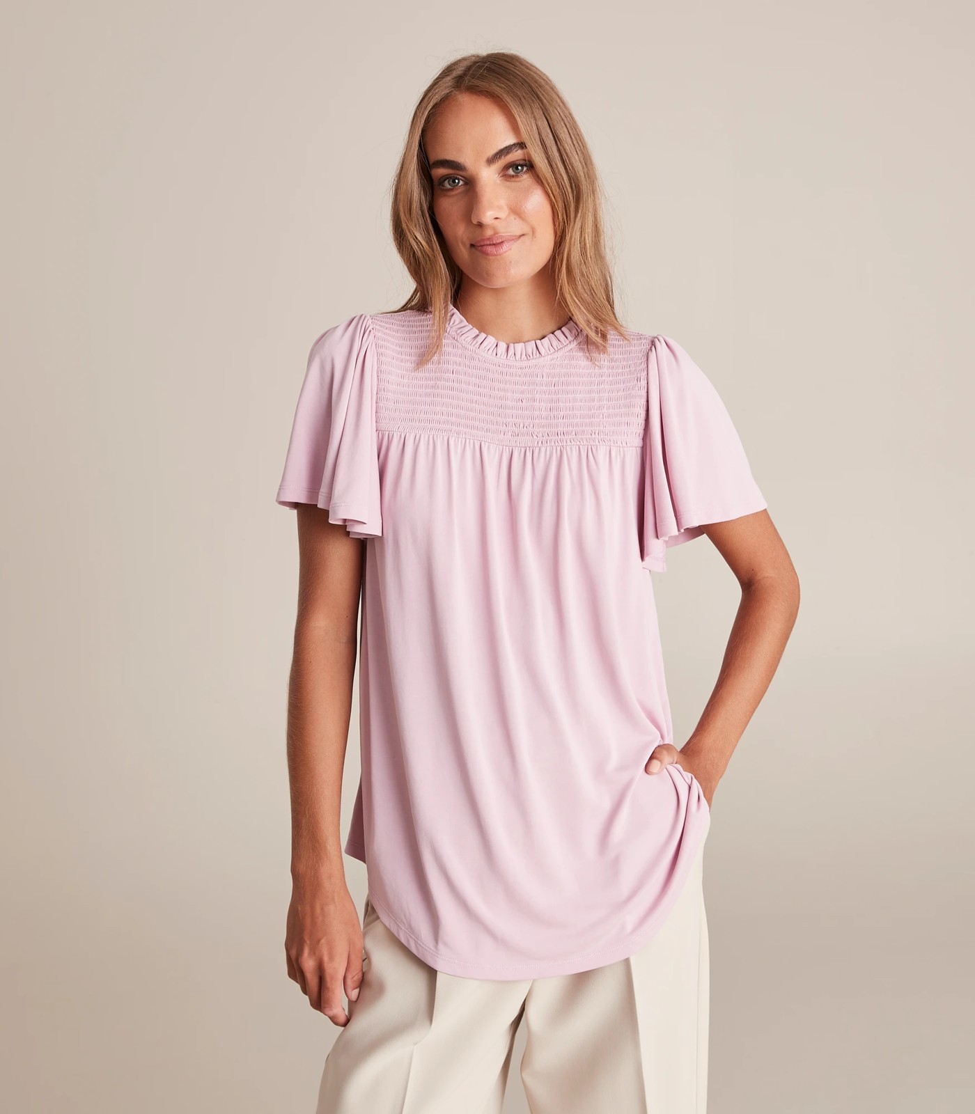 Feminine and flowy, the Preview shirred flutter sleeve top will be a must have for woman who love to show their 'girly' side. It features a round neckline with upper frill, a shirred upper chest panel, short flutter sleeves and a curved hemline to flatter your shape.
