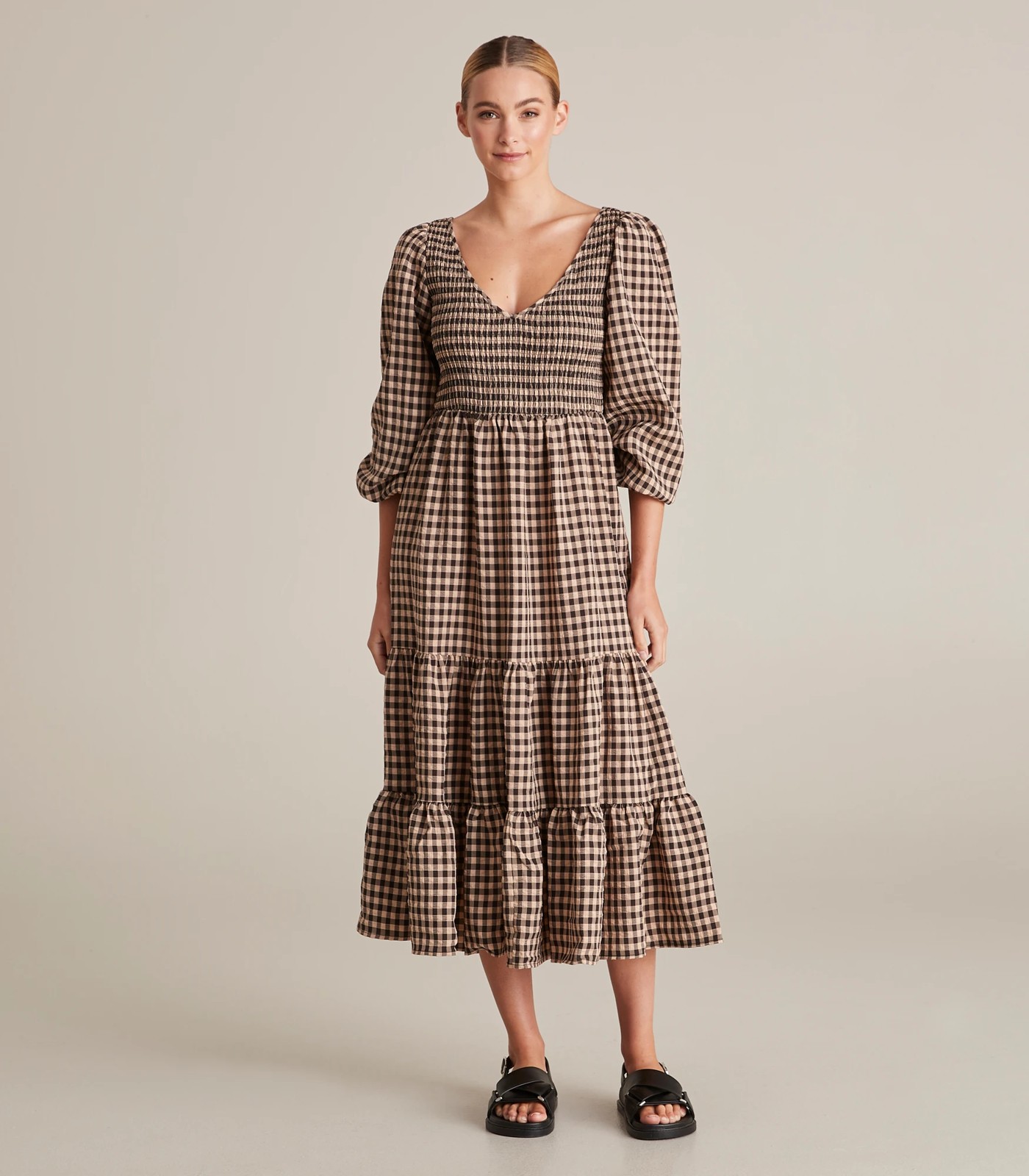 The perfect addition to any wardrobe, the Preview shirred midi dress has a light polyester fabrication, an all over gingham print, a v-neckline, a shirred bodice and a midi length.