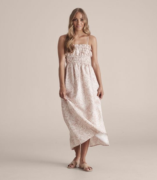 For a great sunny day dress for the girl on the go, the palm print Preview shirred midi sundress features a lined inside with a shirred stretch bodice and a midi length.