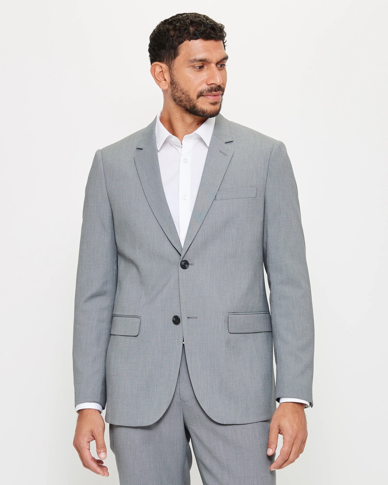 Welcome to the world of classic style with the Preview Textured Suit Jacket. The fully lined jacket is made with recycled materials and features a tailored fit and a silver color that will give you an instant polished look. It is designed with twin button closure, button through cuffs, three outer pockets and two internal pockets for maximum comfort and convenience.