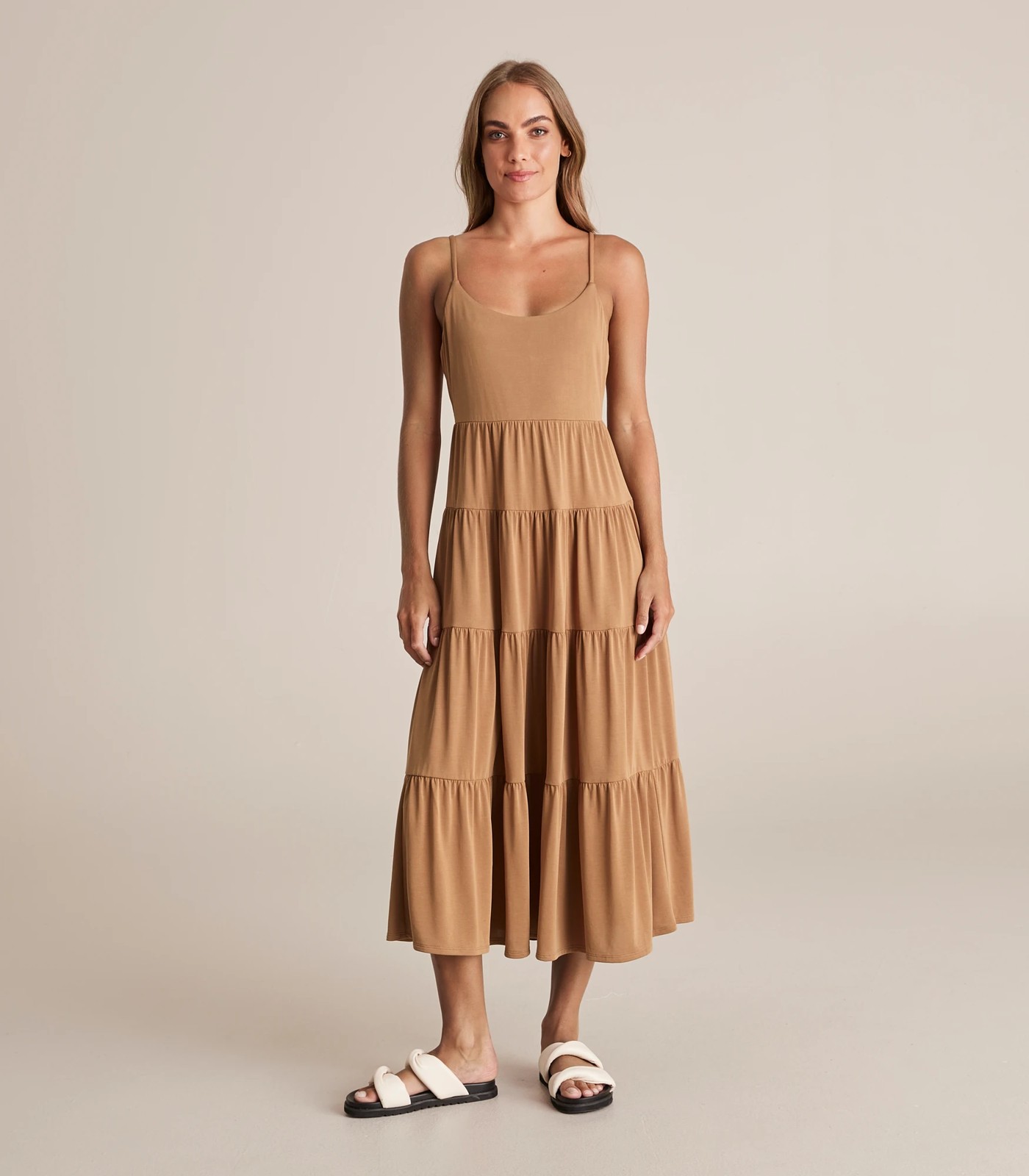 The perfect addition to any summer wardrobe, the Preview sleeveless tiered slip maxi dress has a light and silky feel material, a scoop neckline, tiered panels throughout and a maxi length.