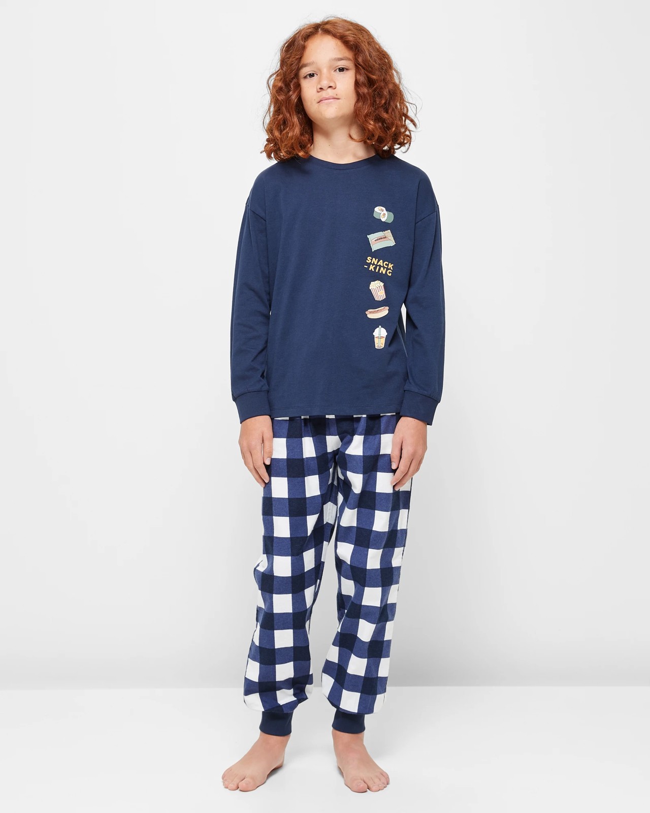Embrace bedtime comfort with our Food Cotton Pyjama Set. This 2-piece set features a top with small food icon prints, long sleeves with ribbed cuffs, and matching all over check print blue flannelette pants. The crew neck and elastic waistband ensure a snug fit, while the soft cotton fabric promises a cosy night's sleep. Encouraging relaxation and style, this set is perfect for lounging and slumber. Treat your little one to this adorable sleepwear and make bedtime more fun today.