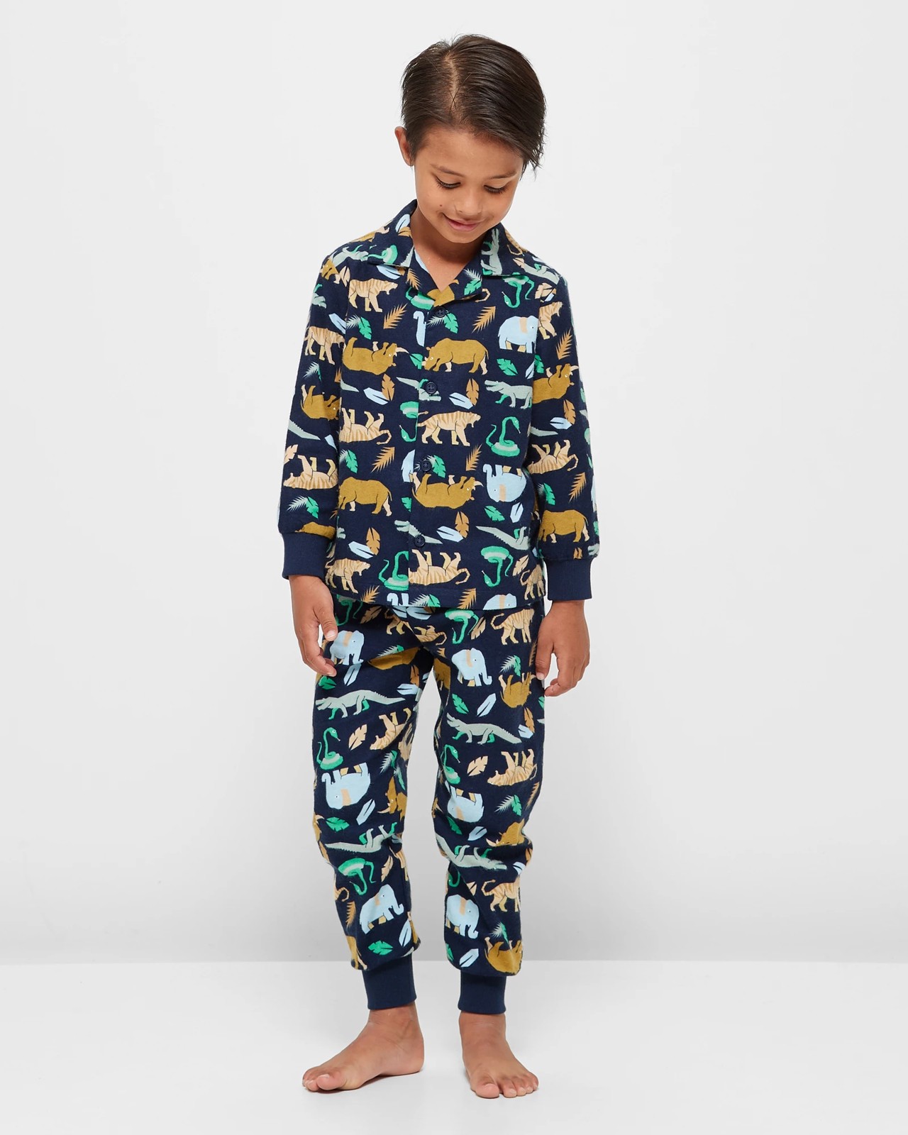 Introducing our Jungle Cotton Flannelette Pyjama Set, the perfect sleepwear for little boys! Made from soft and comfortable cotton flannelette, this regular fit set ensures a cosy night's sleep. The navy blue all-over jungle print adds a playful touch, while the collared design and button-up front provide a classic look. With long sleeves and ribbed cuffs, your little one will stay warm all night long. The straight hem and matching pants with ribbed ancle cuffs and an elastic waistband complete the set. Give your child the gift of a good night's sleep with our Jungle Cotton Flannelette Pyjama Set. Order now and make bedtime fun!