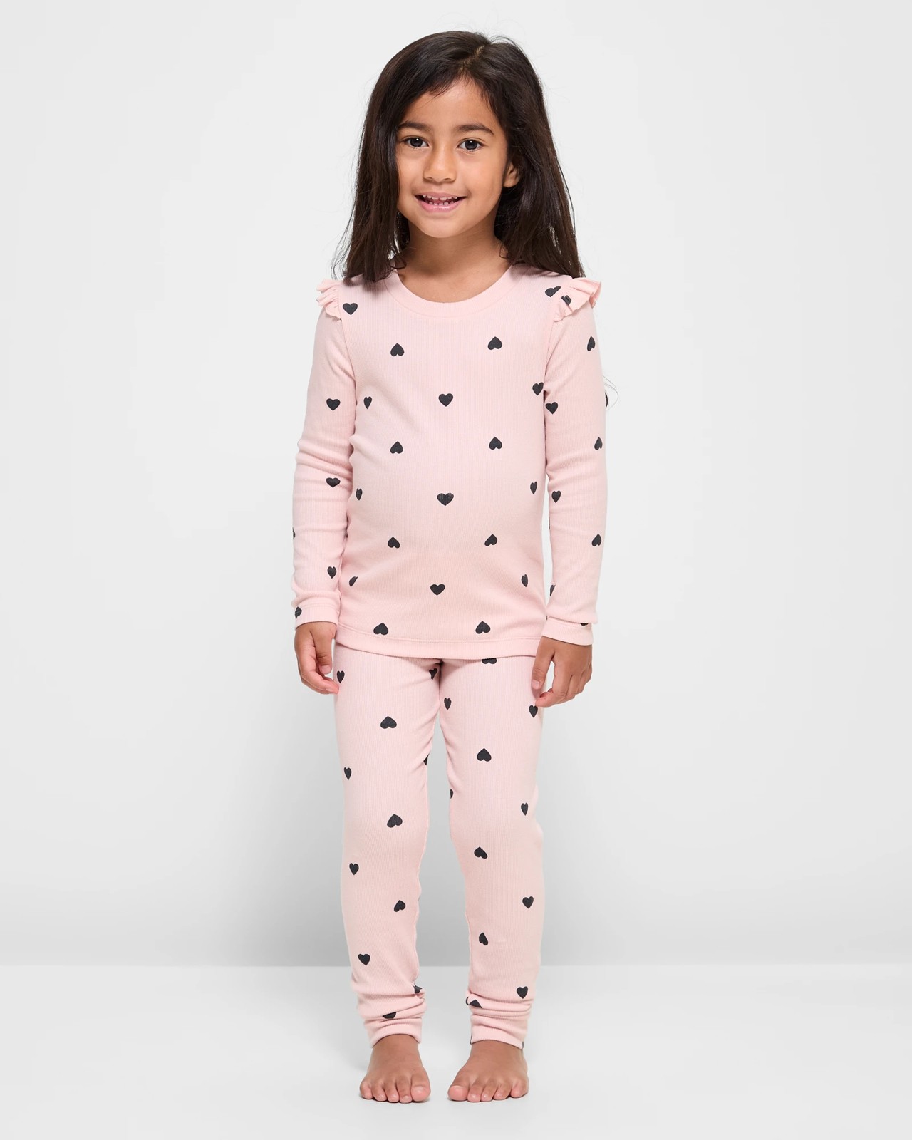 This Girls Print Rib Long Sleeve Pyjama Set combines comfort and style, making it just right for bedtime. Made from soft cotton with a touch of stretch, the set ensures a cosy fit. The long-sleeve top includes charming shoulder ruffles and a ribbed crew neck, adding a playful touch to her nightwear. The matching bottoms feature an all-over heart print with an elastic waistband and cuffed hems for extra comfort. Your little one will look forward to bedtime with this adorable two-piece set. Don’t miss out - add it to your cart today!