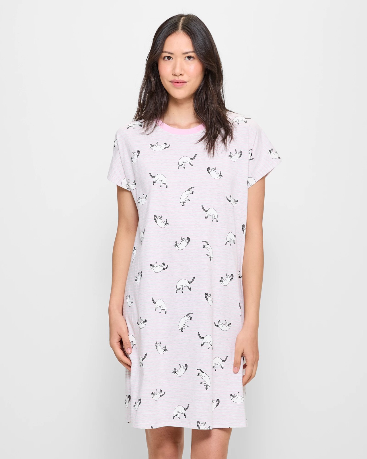 Indulge in comfort with our Printed Sleep T-Shirt Nightie. Crafted from a soft cotton/viscose blend, its regular fit ensures breathability and ease of movement. Featuring a charming grey marl and pink stripe design, with adorable bouncing cat prints all over, you'll drift off to dreamland in style. The ribbed crew neckline and short sleeves add a touch of flair, while the midi length offers maximum coverage. Treat yourself or a loved one to a peaceful night's rest.