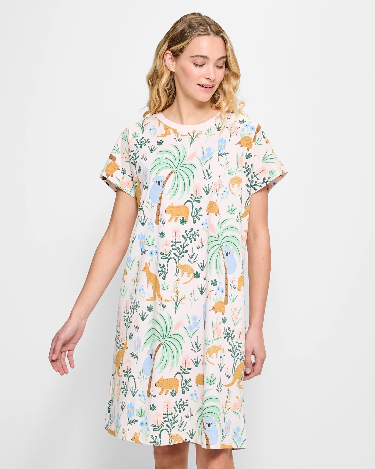 Take your comfort level to the next level with our Print Sleep T-Shirt Nightie. Crafted from cotton fabrication for breathability, this regular fit nightie features a striking color, an all over themed print and a crew neckline. The short sleeves and straight hemline provide a flattering silhouette, while the midi length ensures all day comfort. Perfect for cozy nights in!