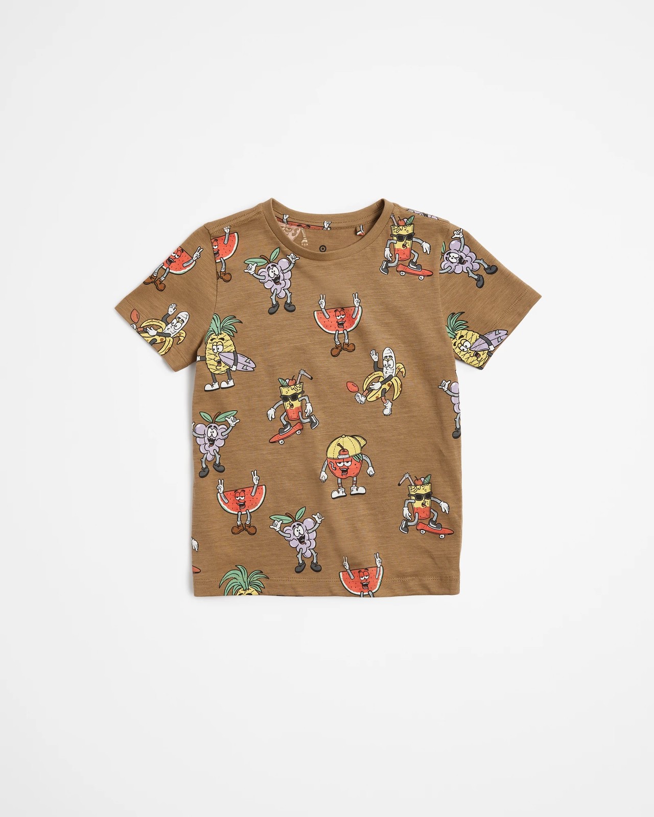 Introducing our Cool Fruit Print T-shirt - the perfect addition to your little ones summer wardrobe. Made from a comfortable and breathable cotton fabric, this t-shirt offers a regular fit for all-day comfort. The eye-catching tan all over cool fruit print adds a touch of fun and style to his outfit. With a ribbed crew neck and short sleeves, it's perfect for casual wear, and the straight hem gives it a sleek and modern look. Shop now and upgrade his style game!
