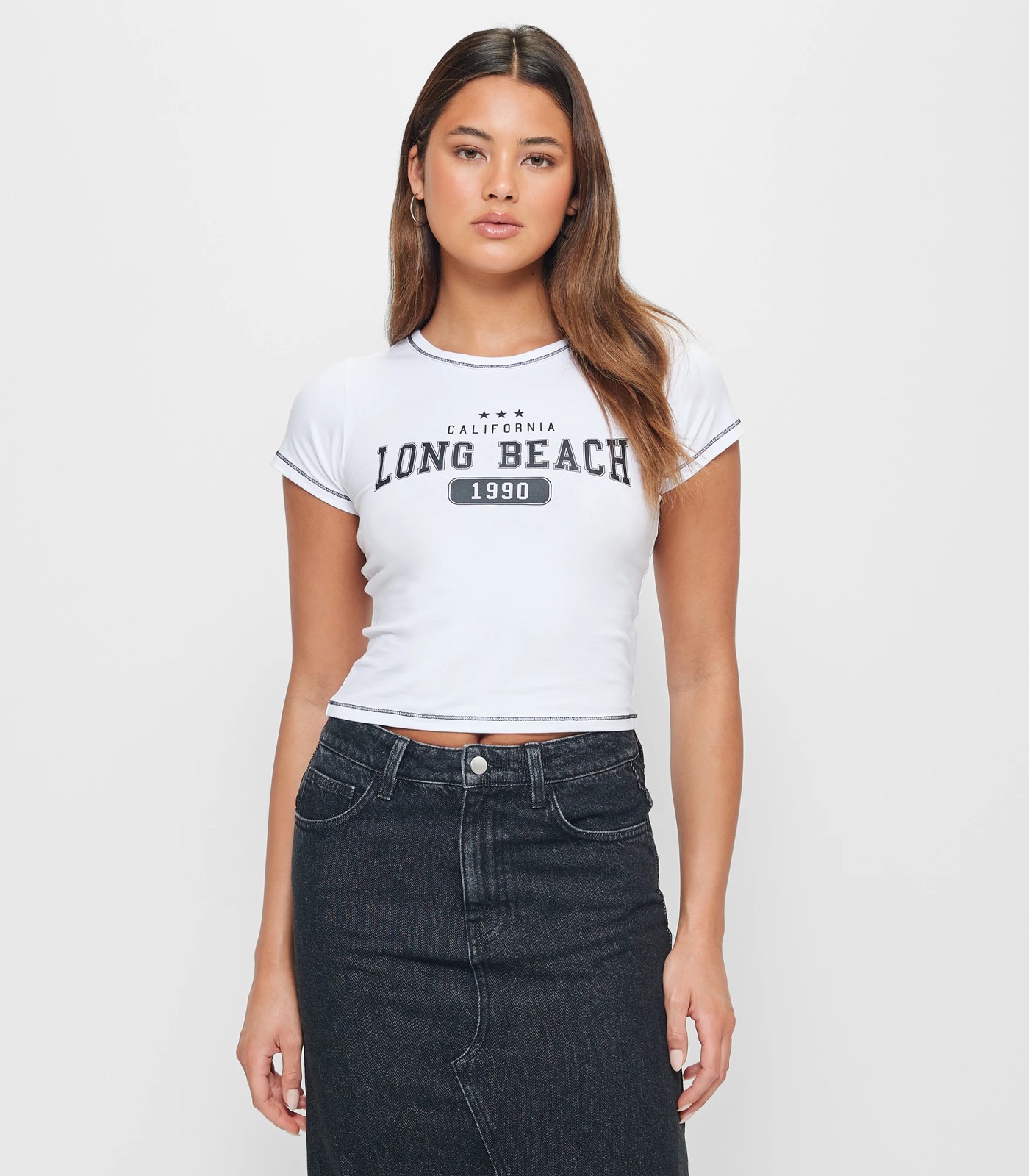 Bold chest print with wording CALIFORNIA LONG BEACH 1990