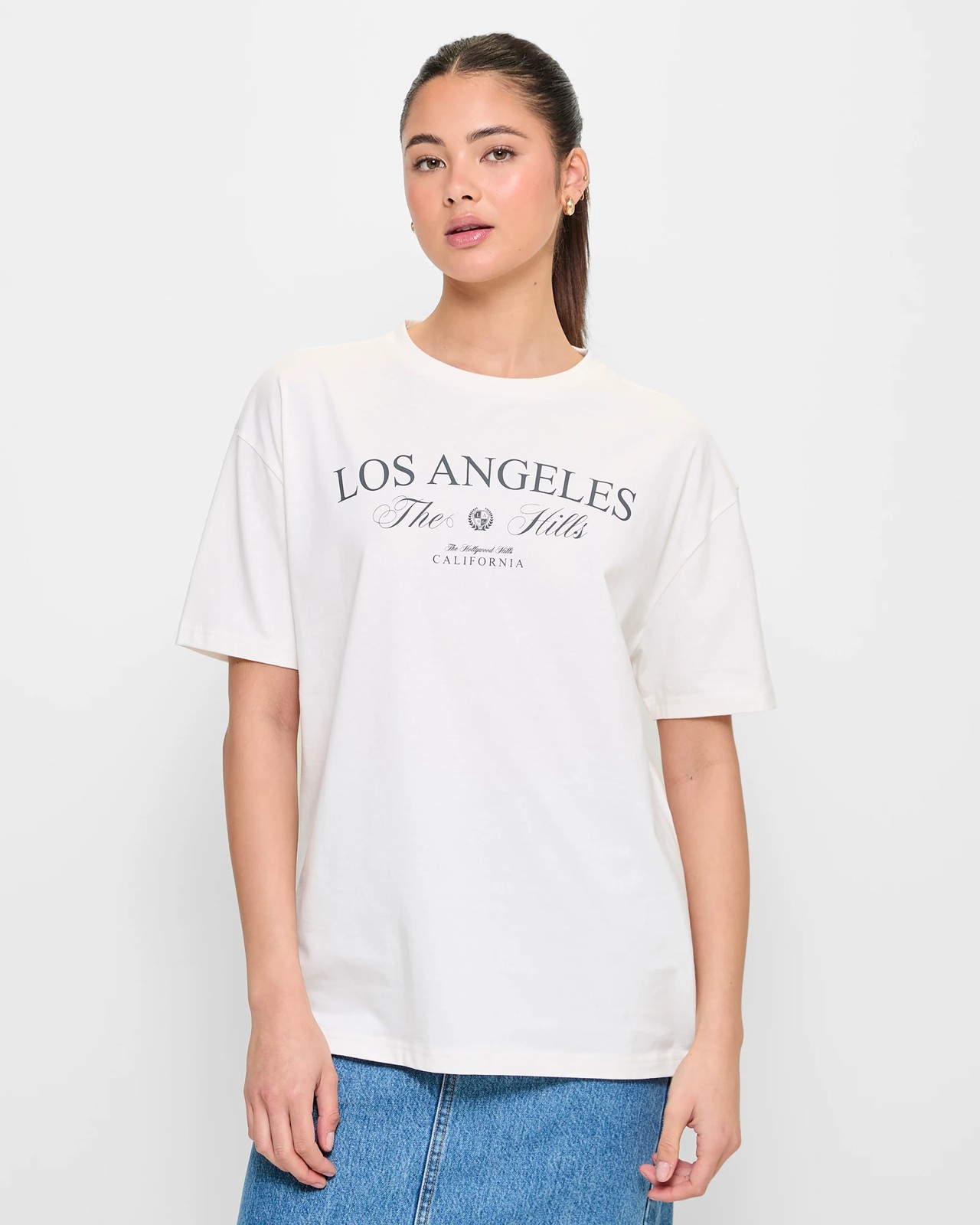 Bold chest print with wording LOS ANGELES THE HILLS CALIFORNIA