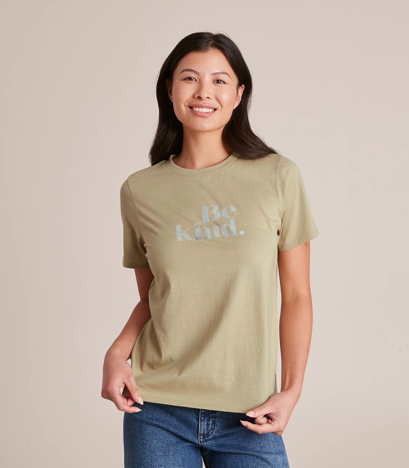 Bold metallic silver chest print "BE KIND."