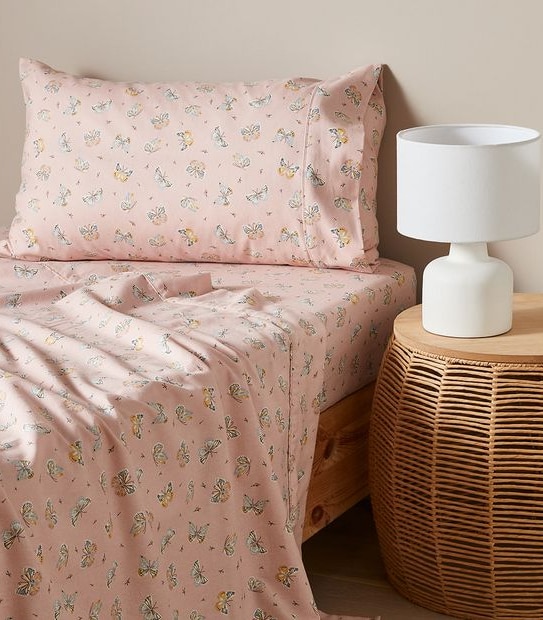 The kids' Printed Flannelette Sheet Set is cosy and comfortable - perfect for cold nights. It features a gorgeous butterfly print on pink flannelette fabric and includes a flat sheet, fitted sheet plus pillowcase/s.