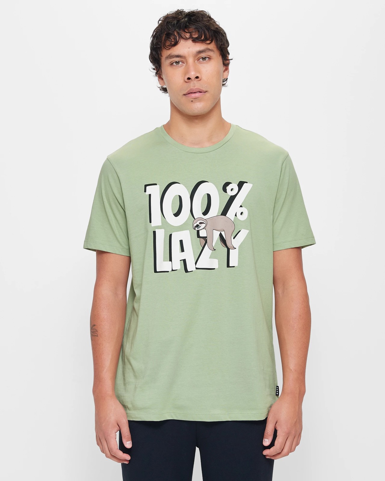 Bold chest print with sloth and wording 100% LAZY