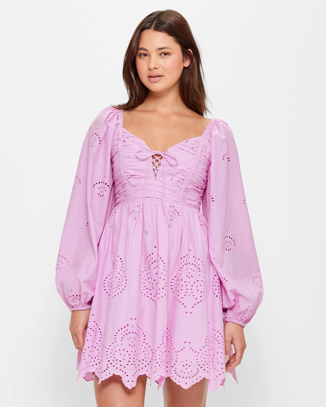 Introducing the stunning Puff Sleeve Embroidered Mini Dress by Lily Loves. Made from premium cotton, this dress offers both comfort and breathability. Its cotton lining ensures extra comfort. With an elegant all-over broderie design, this dress adds femininity to any outfit. The regular fit silhouette flatters your figure while the orchid purple color brings life to your ensemble. Designed with a V-front and square shoulders, this dress exudes elegance. The trendy tie-up front adds a fashionable twist. The long puff sleeves with elastic cuffs bring drama and sophistication. Pleating across the front bodice and structured waistline enhance the silhouette. This versatile mini dress is perfect for brunch dates or garden parties. The back shirred panel adds style and ensures easy movement. Upgrade your wardrobe with the Puff Sleeve Embroidered Mini Dress by Lily Loves and experience charm and elegance like never before. Order now and become the envy of all your friends.