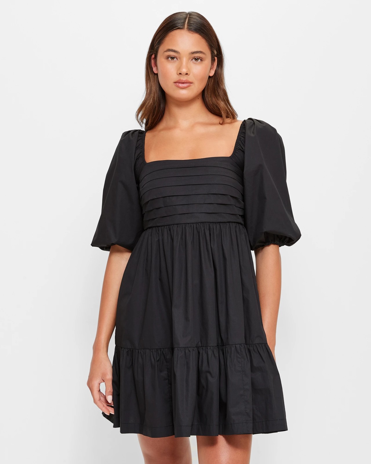 Upgrade your wardrobe with the Puff Sleeve Mini Dress from Lily Loves. Made from a soft and breathable cotton fabric, this dress offers a comfortable and regular fit. Designed with a stylish black colour, it features a convenient pull-on design and a trendy square neckline. The dress is adorned with elastic around the shoulders and short elastic cuff puff sleeves, adding a touch of femininity. With a pleated front and structured underbust, it creates a flattering silhouette. The tiered bottom panel and mini length bring a playful and youthful vibe to your outfit. Complete with a straight hemline and a back shirred centre panel, this dress is both trendy and comfortable. Whether you're heading to a casual day out or a night out with friends, this dress is sure to turn heads. Grab your size now and elevate your style!