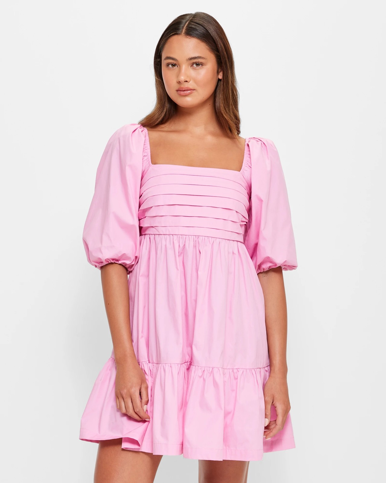 Introducing the Puff Sleeve Mini Dress from Lily Loves. This stunning dress is made from a high-quality cotton fabrication, ensuring maximum comfort and durability. The regular fit flatters all body types, while the beautiful bubblegum colour adds a playful touch to your outfit. The dress features a convenient pull-on design and a square neckline, adding a stylish twist. The elastic around the shoulders and short elastic cuff puff sleeves provide a comfortable and fashionable feel. The pleated front and structured underbust enhance your silhouette, while the tiered bottom panel adds a touch of elegance. The mini length and straight hemline create a trendy and youthful look. The back shirred centre panel adds a unique detail to the dress. Complete your summer wardrobe with this must-have dress and turn heads wherever you go! Shop now and embrace your inner fashionista!