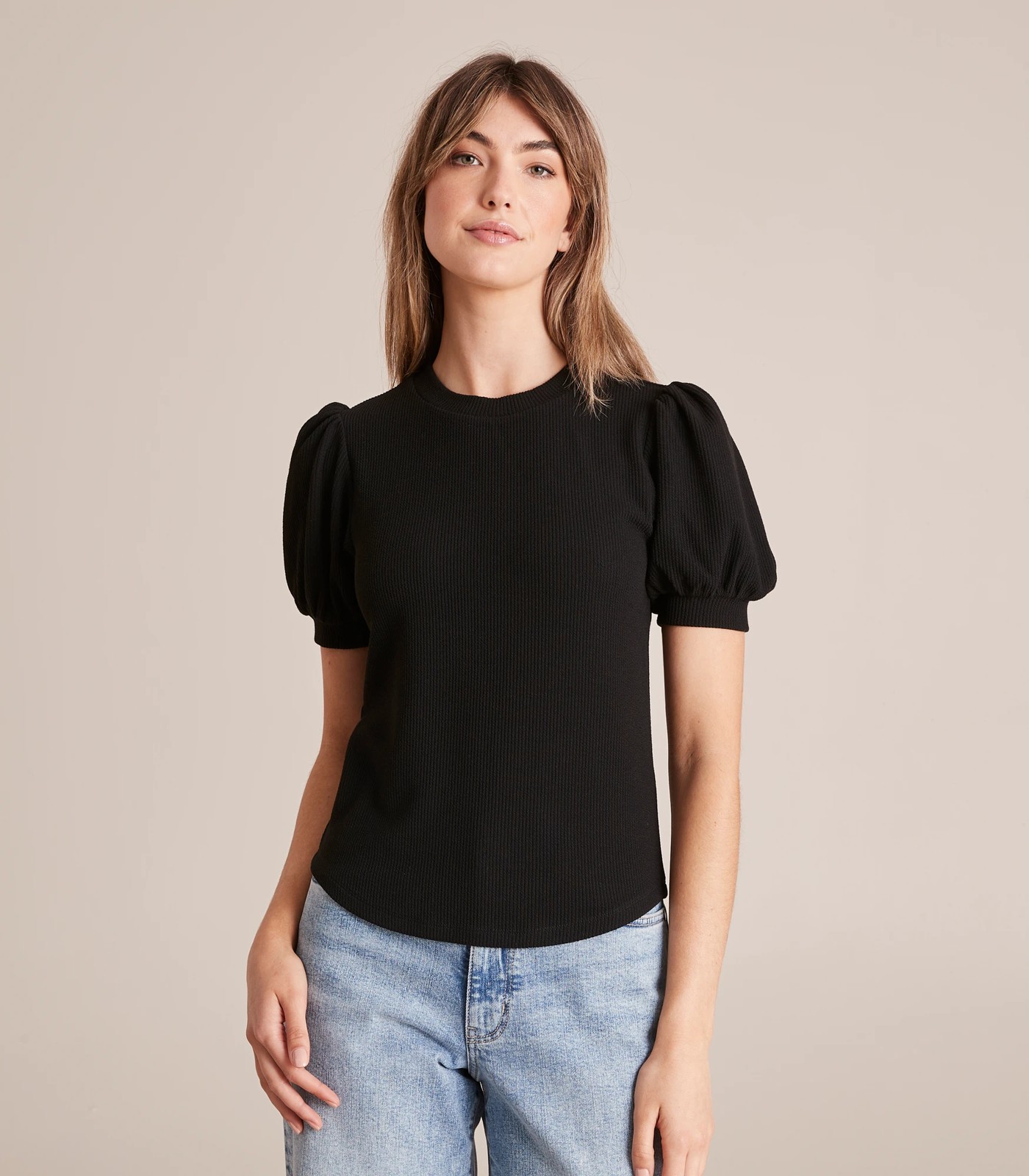 The cutest top for day to night, the puff sleeve rib tee has a short puff sleeve, a crew neckline and an all over ribbed design.