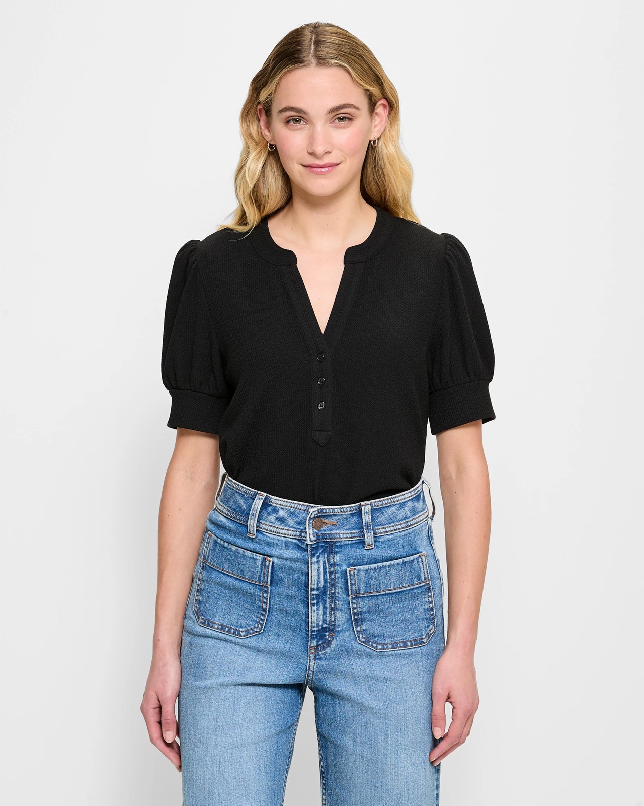 Introducing our stylish Puff Sleeve Ribbed Henley T-Shirt for women. Made from a comfortable polyester/viscose blend, this t-shirt features a stretchy fabric that ensures optimum comfort throughout the day. We pride ourselves in using recycled materials for this tee. The all-over ribbed design adds a trendy touch, while the regular fit ensures a flattering look on any body shape. With its classic henley design and a round neckline with a front v-drop, this t-shirt is both fashionable and practical. The button-down front and short puff sleeves with thick cuffs add a touch of elegance, while the straight hemline completes the look. Upgrade your wardrobe with this versatile piece. Shop now and enjoy effortless style and comfort!
