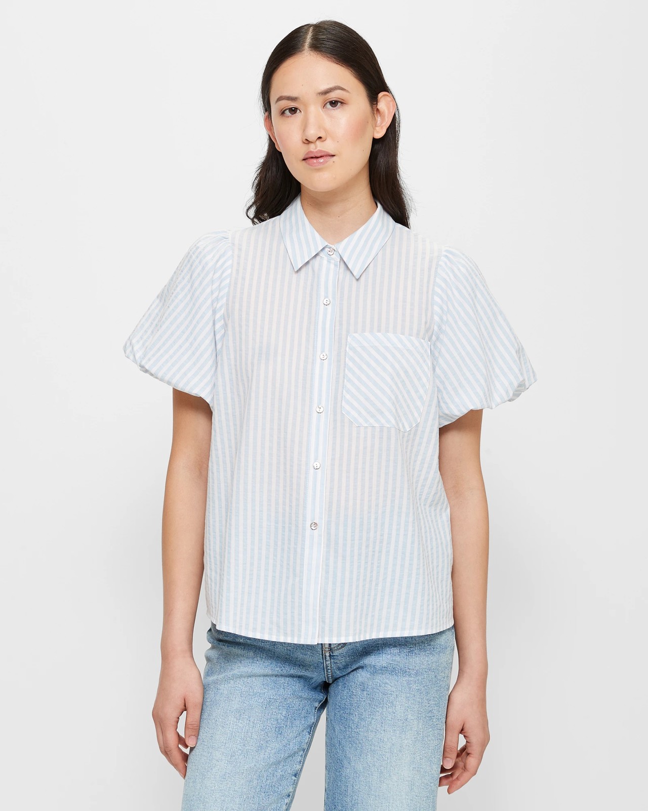 Introducing our stunning Puff Sleeve Shirt, a must-have addition to any wardrobe. Made from a luxurious blend of cotton and modal, this shirt is designed to keep you comfortable all day long. The regular fit flatters all body shapes, while the light blue and white striped pattern adds a touch of sophistication. The round collared neckline and short puff sleeves with inner elastic cuffs create a trendy, feminine look. Whether you're headed to the office or a casual gathering, the button-through front and darting at the chest provide a polished finish. Complete with an open chest pocket and curved hemline, this shirt offers both style and practicality. Get yours now and elevate your wardrobe to new heights!