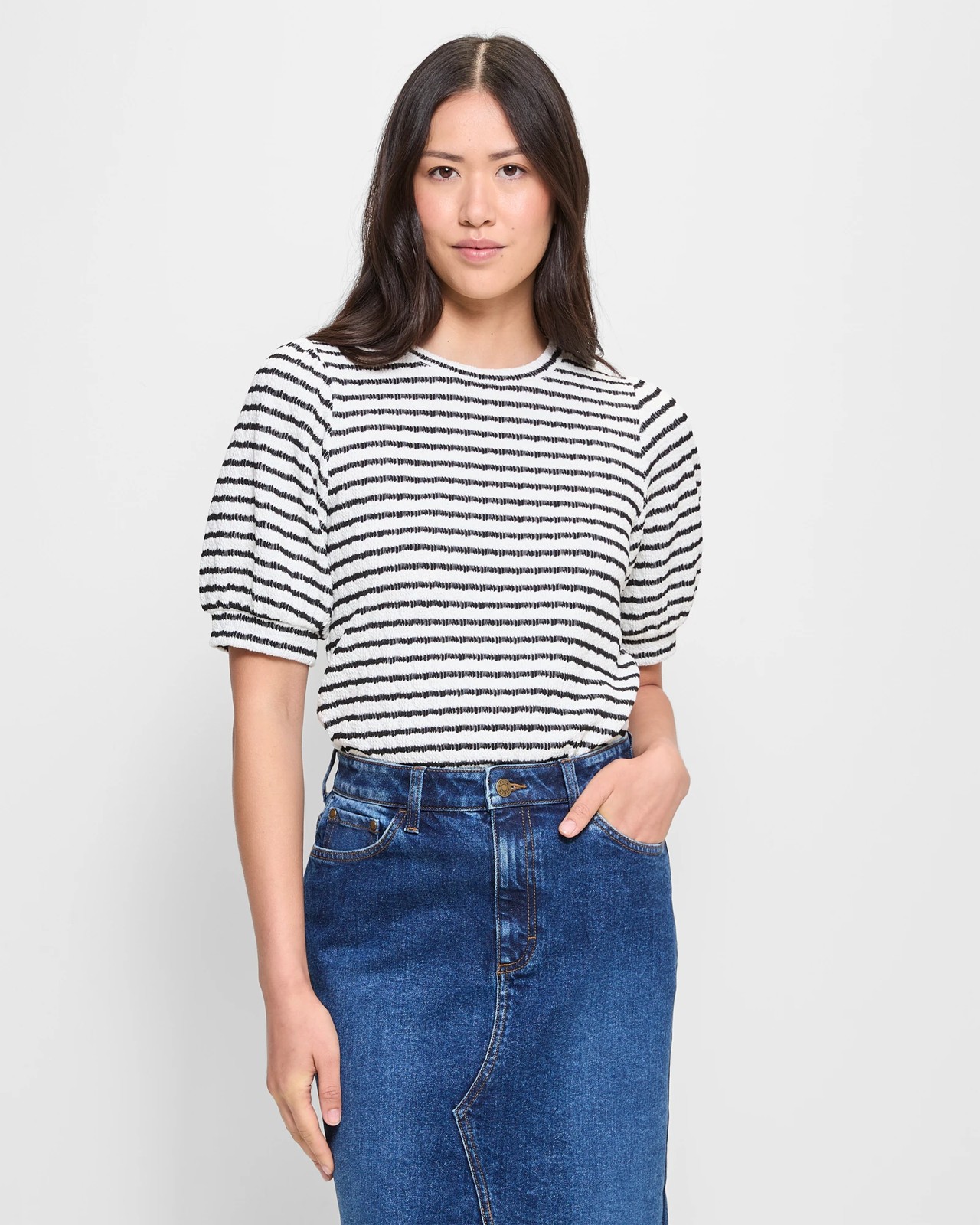 Step up your casual attire with our Puff Sleeve T-Shirt designed for women. Made from a soft blend of polyester and cotton, the addition of elastane ensures unrestricted movement and comfort. Featuring a unique textured pattern, this top fits regularly with a classic crew neckline. The short, puffed sleeves with cuffs and the curved hem provide a stylishly modern yet relaxed look. Add this charming piece to your wardrobe and experience comfort with a touch of whimsy.