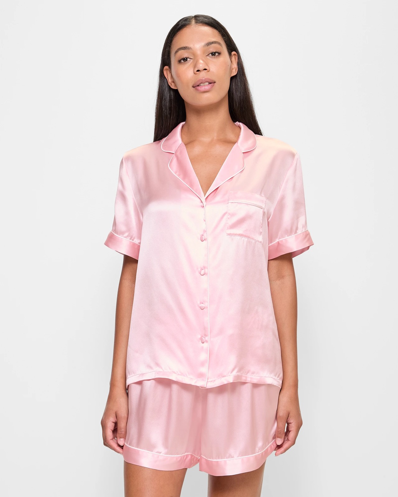 Experience the ultimate in comfort with our Silk Short Pyjama Sleep Set. This elegant two-piece set, made from luxurious silk, promises a soft and gentle touch against your skin, making every night feel indulgent. The pink shirt features a charming round collar with classic lapels and white piping, complemented by a convenient open chest pocket and short sleeves. The matching shorts, with their elastic waistband and white piping along the cuffs, ensure a perfect fit and effortless style. Embrace this delightful pyjama set for a blissful night's sleep and wake up refreshed. Grab yours now and transform your bedtime routine.