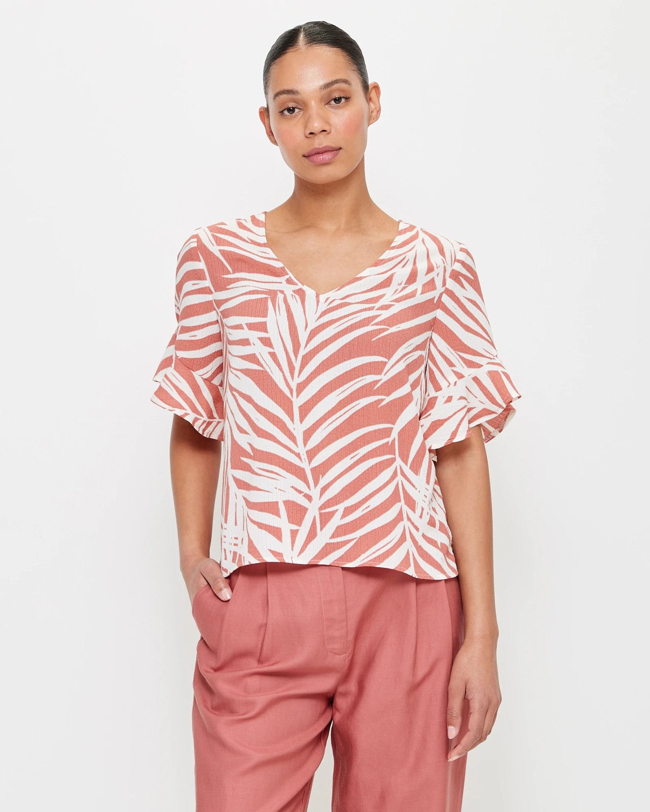 A great everyday design that is great for everyday wear, the Preview Queenie woven shell top features a v-neckline, short flutter sleeves and straight hemline with side seam splits for a flattering fit.