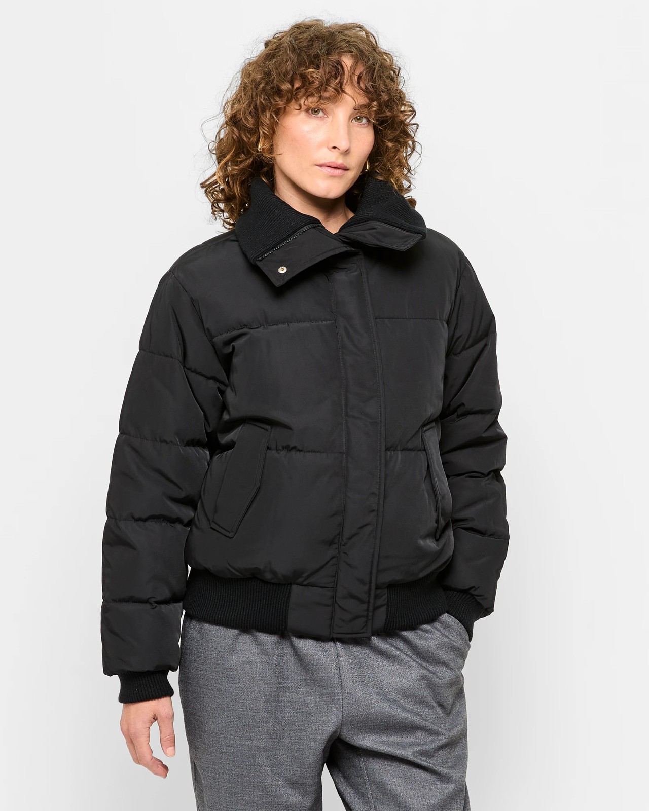 Discover warmth and style with our women’s Quilted Bomber Jacket. This black jacket features a soft polyester shell and cosy inner lining for those chilly days. The ribbed high neckline and cuffs add a touch of elegance, while the hidden zip and press stud closure provide a clean, trendy look. With a regular fit and handy side pockets, this quilted jacket is as functional as it is fashionable. Don't miss out on adding this timeless piece to your collection.