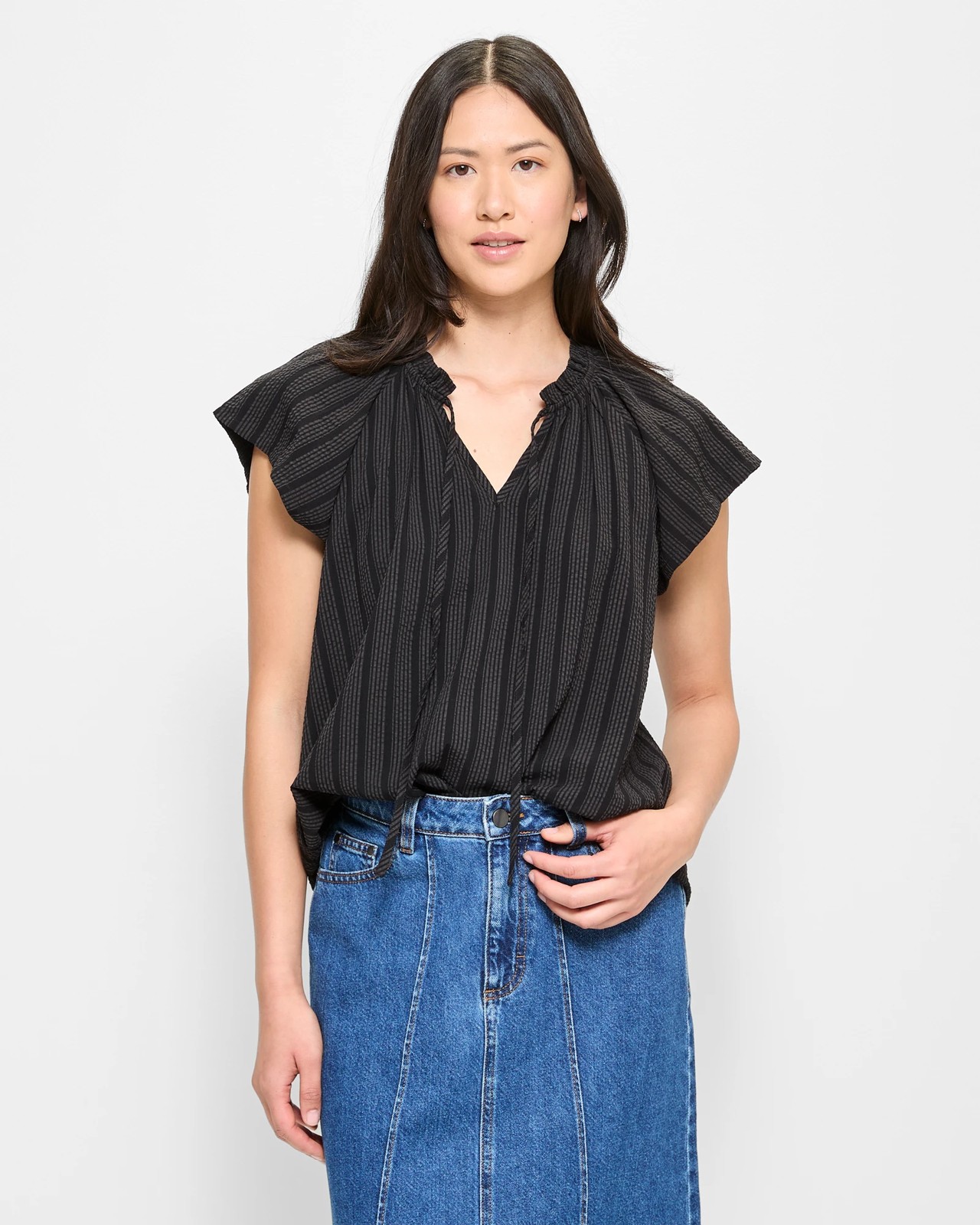 Step into effortless style with our Raglan Flutter Sleeve Top. This delightful top, made from a blend of viscose and cotton, offers a breathable and light feel, perfect for any occasion. Its charming self-stripe design and regular fit beautifully enhance your appearance. The unique round tie front neckline, accented with a frilly upper and keyhole detail, adds a touch of whimsy. Short raglan sleeves and a straight hemline complete the carefree look. Refresh your wardrobe with this versatile piece today!
