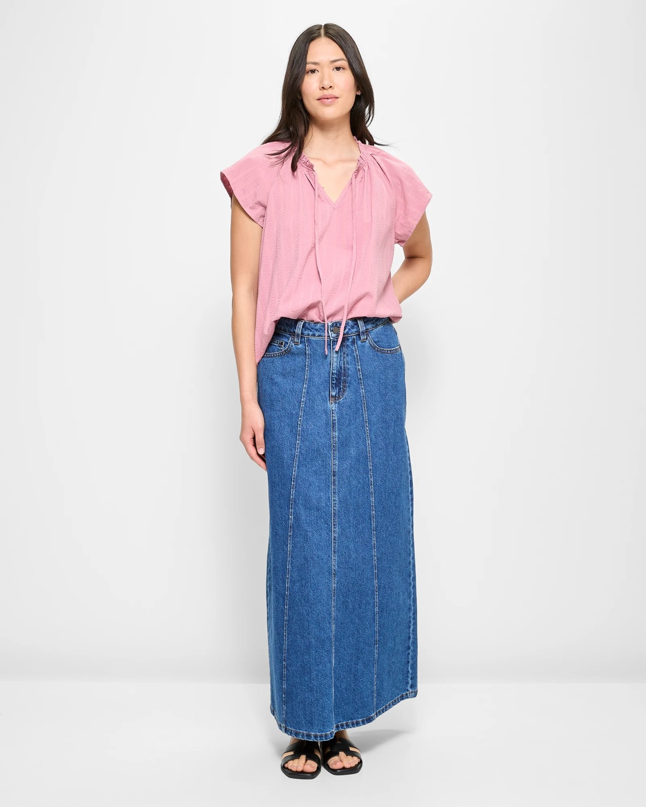 Step into effortless style with our Raglan Flutter Sleeve Top. This delightful top, made from a blend of viscose and cotton, offers a breathable and light feel, perfect for any occasion. Its charming self-stripe design and regular fit beautifully enhance your appearance. The unique round tie front neckline, accented with a frilly upper and keyhole detail, adds a touch of whimsy. Short raglan sleeves and a straight hemline complete the carefree look. Refresh your wardrobe with this versatile piece today!
