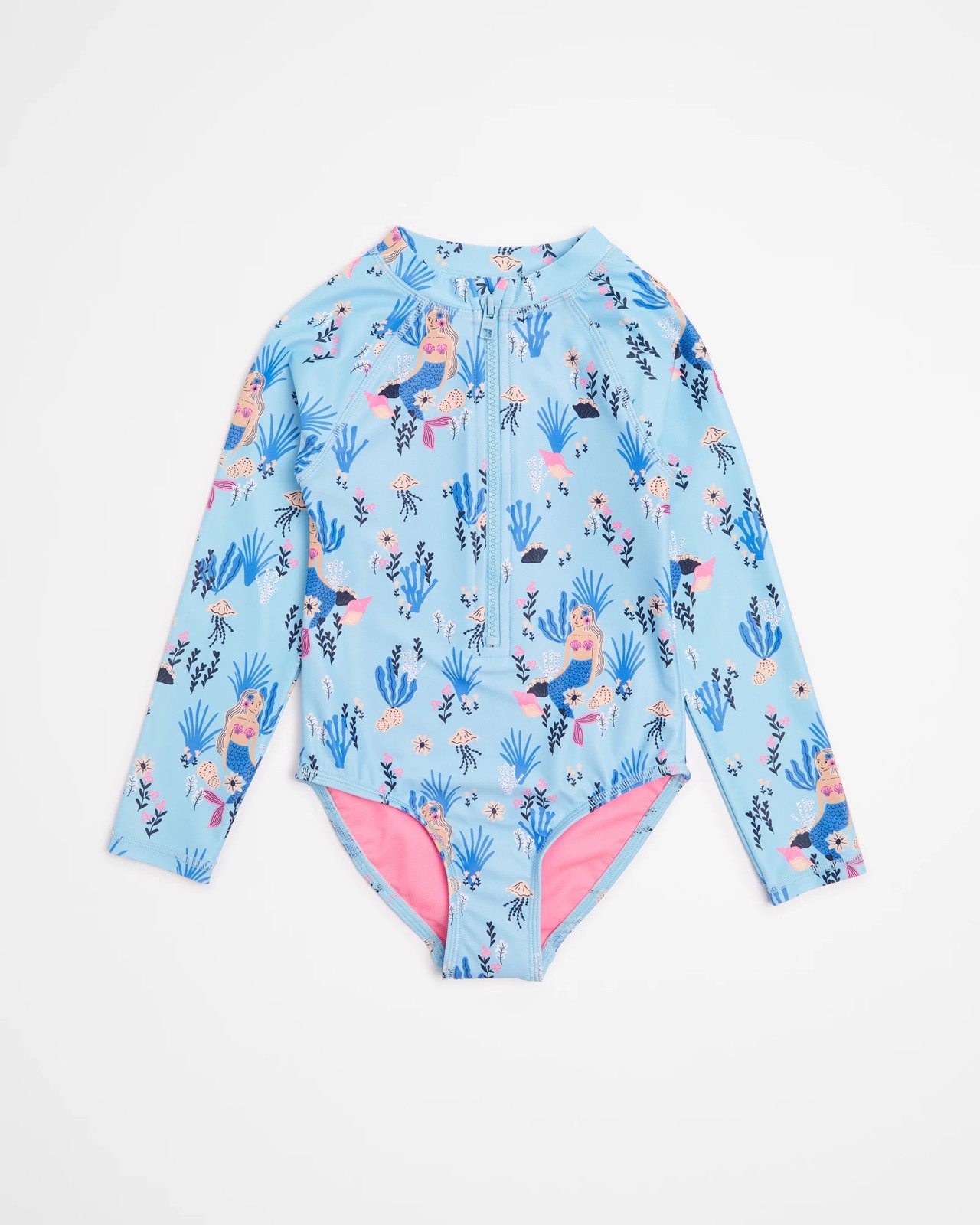 Make a splash with the Raglan Sleeve Mermaid Swim Surfsuit! This swimsuit is designed with great UPF 50+ sun protection and features a regular fit, blue all over mermaid print and stand collar. For full range of movement in the water, this swimsuit offers long raglan sleeves and a zip front. Fully lined for comfort, this is perfect for days spent by the pool or beach.