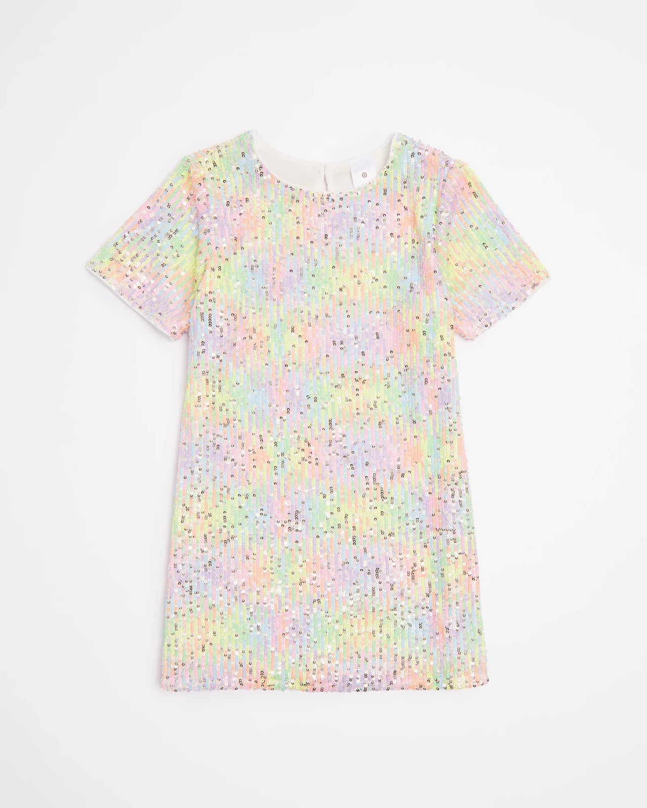 The Rainbow Sequin Shift Dress is the perfect way to light up any girl's wardrobe! This fun and flirty dress features an all-over sequin design with a bold multi-colour pattern, giving it an eye-catching look. It has a regular fit with a round neckline, short sleeves and a straight hem. The dress also has a keyhole button at the centre back neck and is fully lined for comfort. Make sure she stands out in this bright and beautiful dress - get the Rainbow Sequin Shift Dress today!