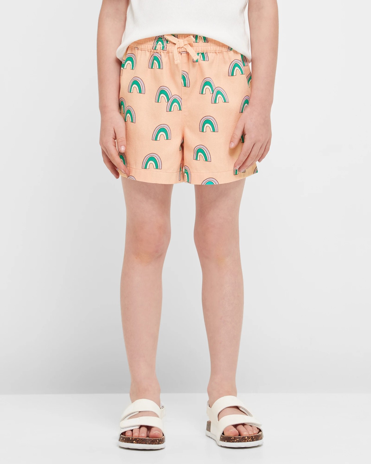Introducing our Rainbow Shorts, perfect for adding a pop of colour to your summer wardrobe. Made from high-quality cotton rich fabric, these shorts offer a regular pull-on fit for maximum comfort. Featuring a delightful peach all over rainbow print, these shorts are a fun and stylish choice for any occasion. The elastic waistband with bow applique adds a charming detail, while the short length is perfect for staying cool in the sun. Whether you're strolling along the beach or enjoying a picnic in the park, our Rainbow Shorts are sure to brighten up your day. Shop now and embrace the vibrant energy of the rainbow!
