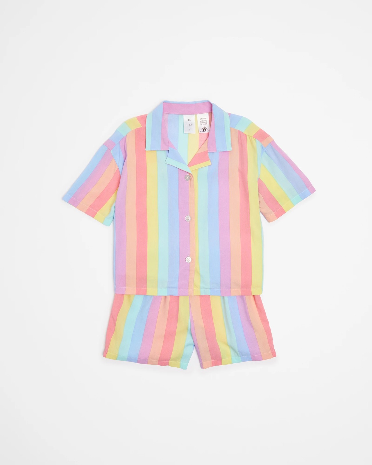 Make bedtime fun with these Rainbow Stripe Pyjama Set! This two-piece sleep set is crafted from a lightweight and soft viscose fabric for ultimate comfort. The regular fit top features a colorful rainbow stripe print, collared neckline, button down front and short sleeves. The straight hem design pairs perfectly with the matching shorts featuring an elastic waistband for an easy fit. Let her show off her style in this vibrant pyjama set!