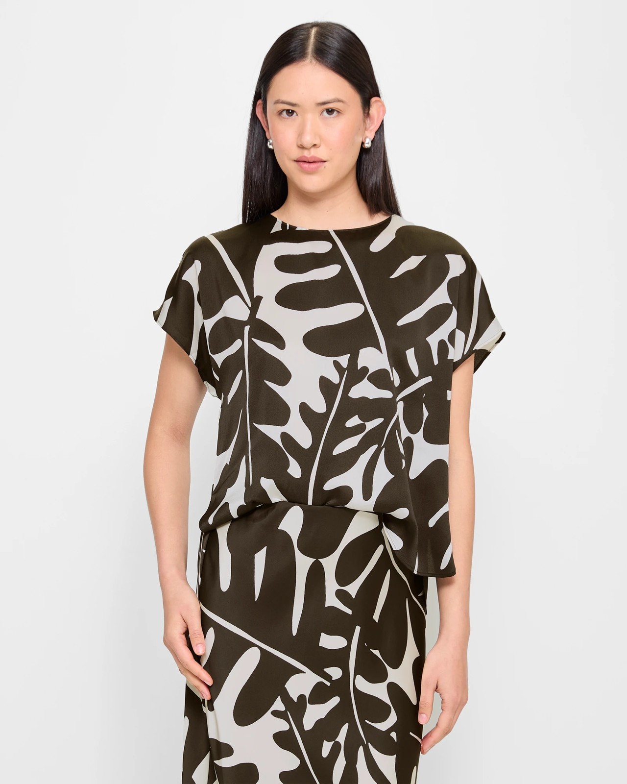Indulge in relaxed elegance with our satin shell top. Enjoy the soft satin feel against your skin as you move through your day in comfort. The relaxed fit creates a chic and easy-going look, perfect for various occasions. Featuring a rounded neckline, short sleeves and a curved, stylishly flowing hemline, every detail is thoughtfully created. The back cross covered closure with inner and outer button closures adds both style and functionality, while the back centre pleat enhances the overall design. Elevate your wardrobe with key features that blend style and comfort seamlessly.