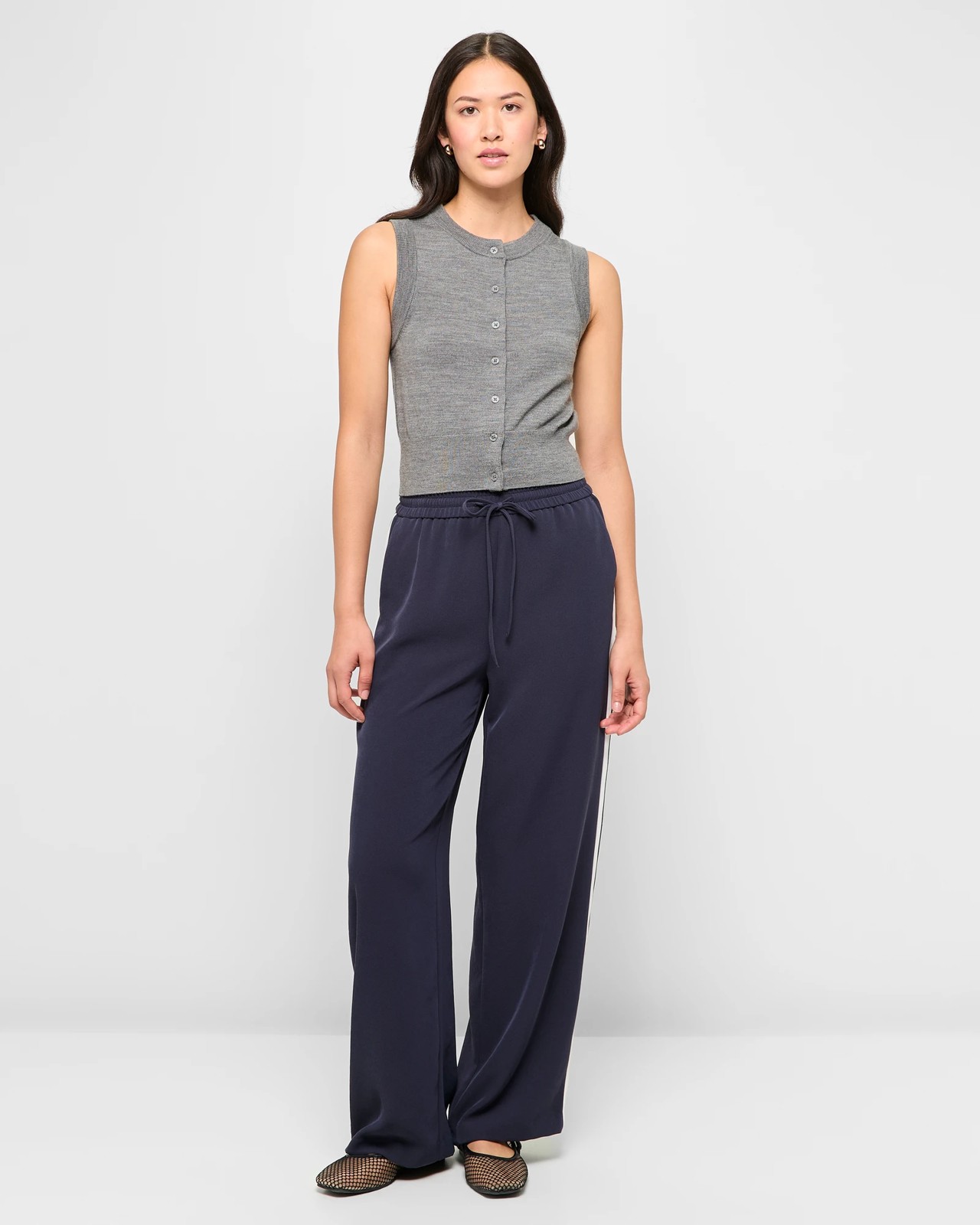Step into effortless style with these Relaxed Side Piping Detail Pants. Using a light and breathable polyester, they offer a relaxed fit in a stunning oxford blue. The pull-on design features an elastic waistband with a drawstring for excellent adjustability. Highlighted with white piping down the legs, these wide-leg trousers have side seam pockets for added convenience. The full-length design with a straight hemline brings both sophistication and comfort to your wardrobe. Make these your go-to trousers for any occasion.