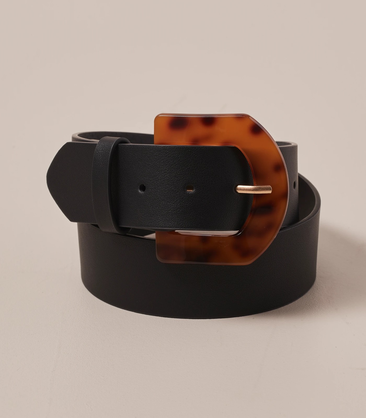 Take your outfit up a notch with the stylish resin buckle belt. It comes in black and has a large resin tortoise shell buckle.