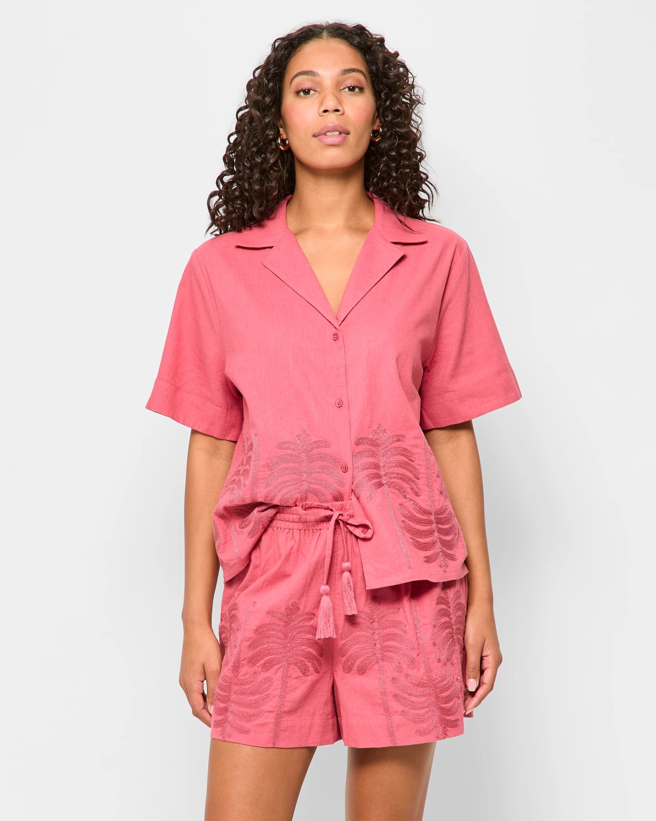 Enjoy unbeatable comfort and charming flair with these resort-inspired shorts, made from a cotton and linen blend for a naturally breezy feel. The soft inner lining and relaxed fit offer daylong ease, while the palm embroidery along the hem brings a subtle touch of holiday fun to your outfit. An elastic waistband with a drawstring allows the perfect fit, and convenient side seam pockets are ideal for whatever you need to carry on your adventures. Slip these on for a stroll by the coast or a laid-back afternoon in the park and let your outfit bring holiday vibes to every day.