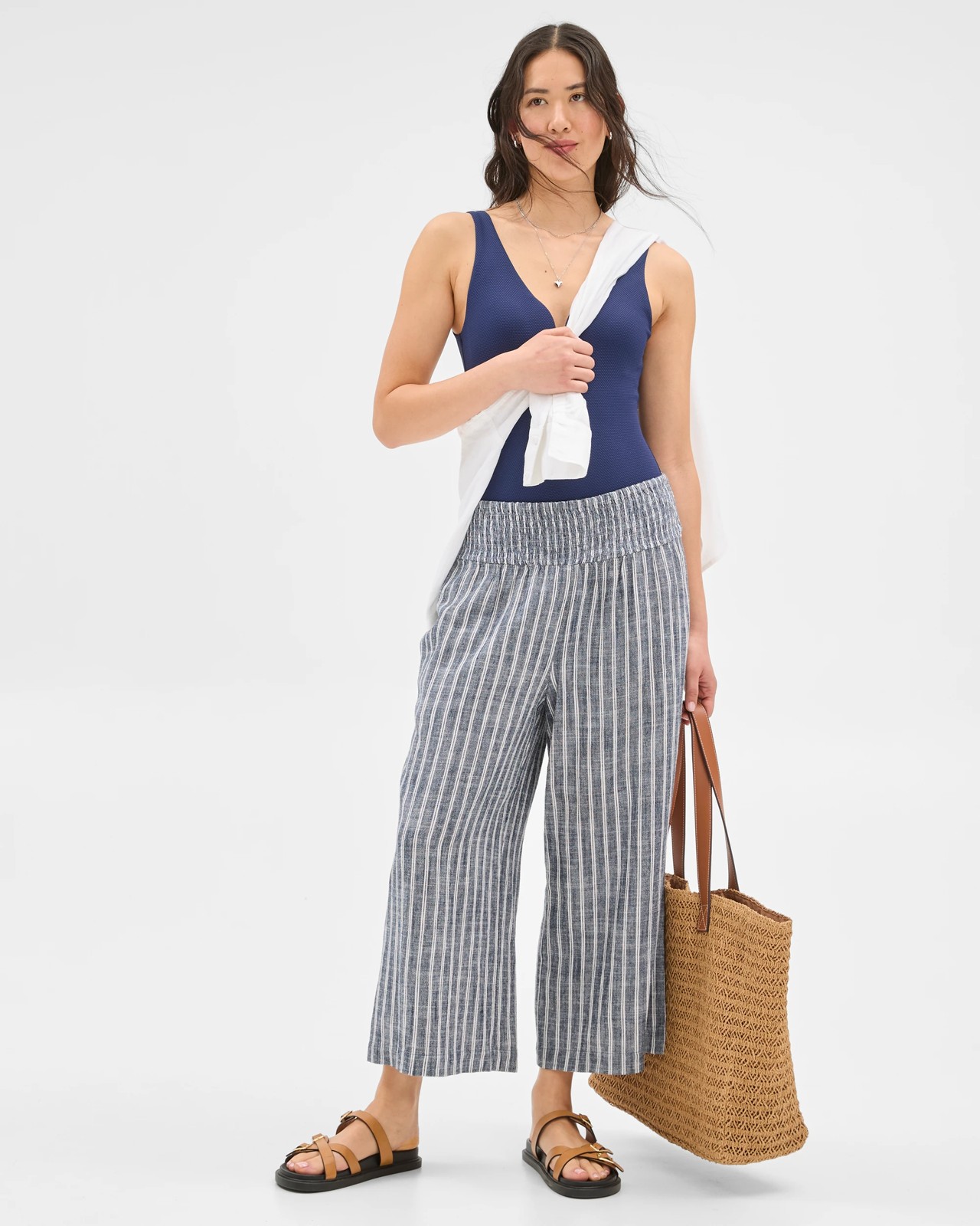 Enjoy a breezy update to your wardrobe with the Resort Stripe Culotte Pants. These trousers combine a comfortable high waist with a stretchy, shirred waistband for all-day wear. Their stripe pattern and textured finish add a playful twist to any look, while the light viscose and linen blend keeps you comfortable in warm weather. The wide leg design and cropped length offer easy movement, and side pockets keep your essentials close at hand. Make these culottes your go-to piece for relaxed days out and easy-going evenings with friends.