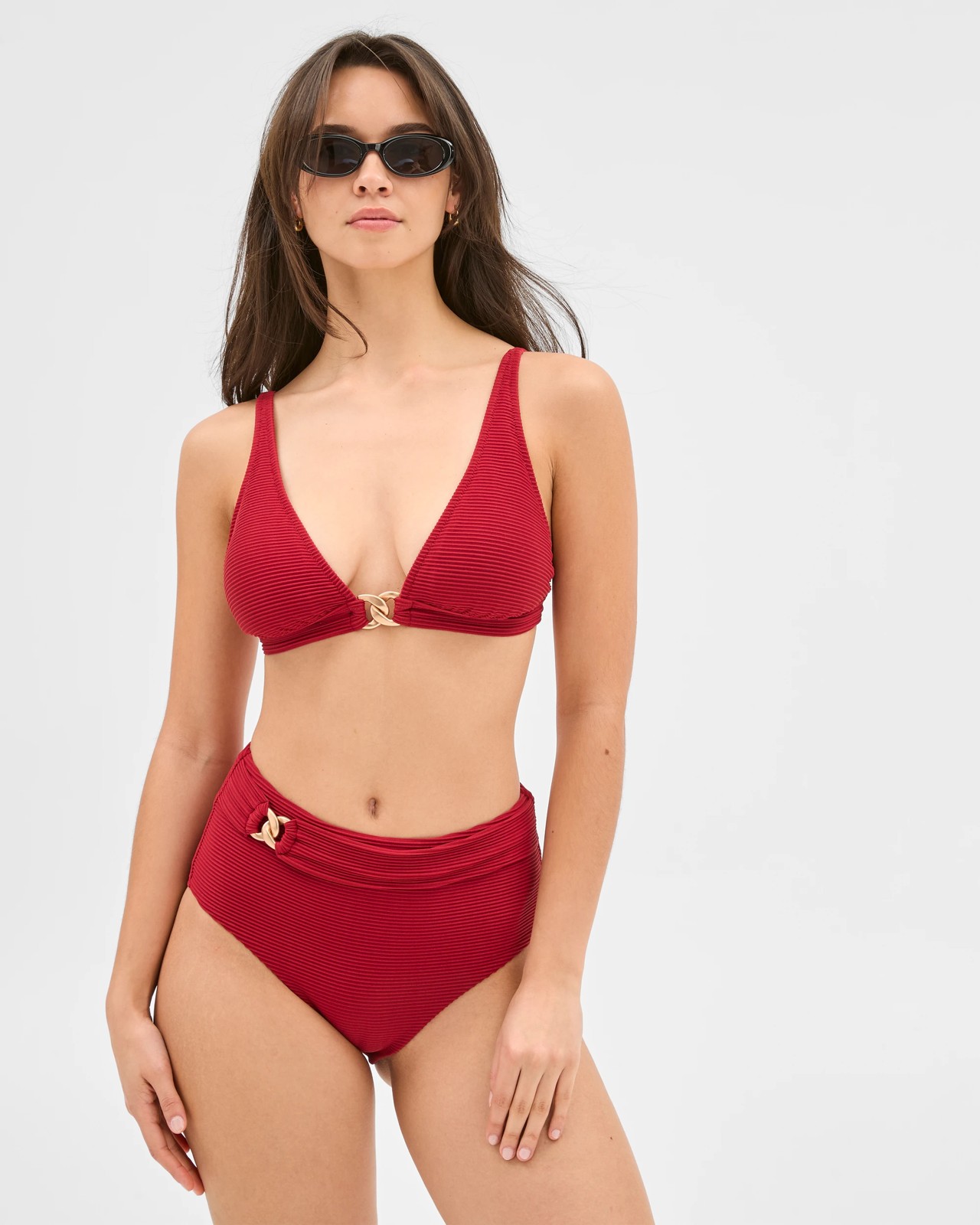 Step into holiday mode with this Resort Textured V-Neck Chain Link Bikini Top. Designed to provide both comfort and style, its crinkle-textured fabric hugs your shape, while the deep v-neck and chic chain link detail add just the right amount of glam. The adjustable straps and wire-free support ensure you feel at ease whether lounging by the pool or soaking up the seaside sun. Removable padded cups give you the freedom to customise your fit, and the back s-clip makes getting ready a breeze. Pair it with matching bottoms for a confident and polished summer look that will have you feeling fabulous. Treat yourself today and make a splash this season.