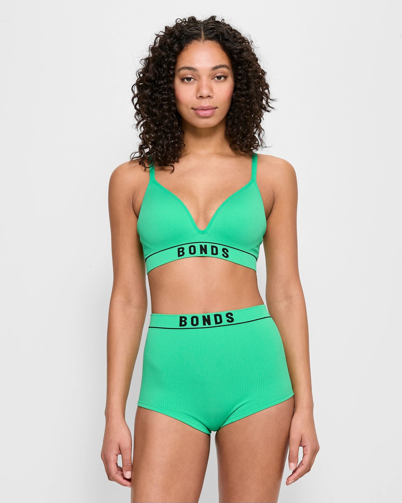 Step into vintage charm with the Retro Rib T-Shirt Crop Bra from Bonds. Designed from nylon and polyester blend, this crop bra offers comfort with its stretchy rib knit design. The deep v-front and thin shoulder straps enhance its stylish look, while the comfortable thick underband ensures it stays perfectly in place. Ideal for everyday wear, this wire-free bra features an embroidered Bonds logo on the underband for a touch, making your everyday moments special. Don't miss out – experience the blend where style meets comfort today!