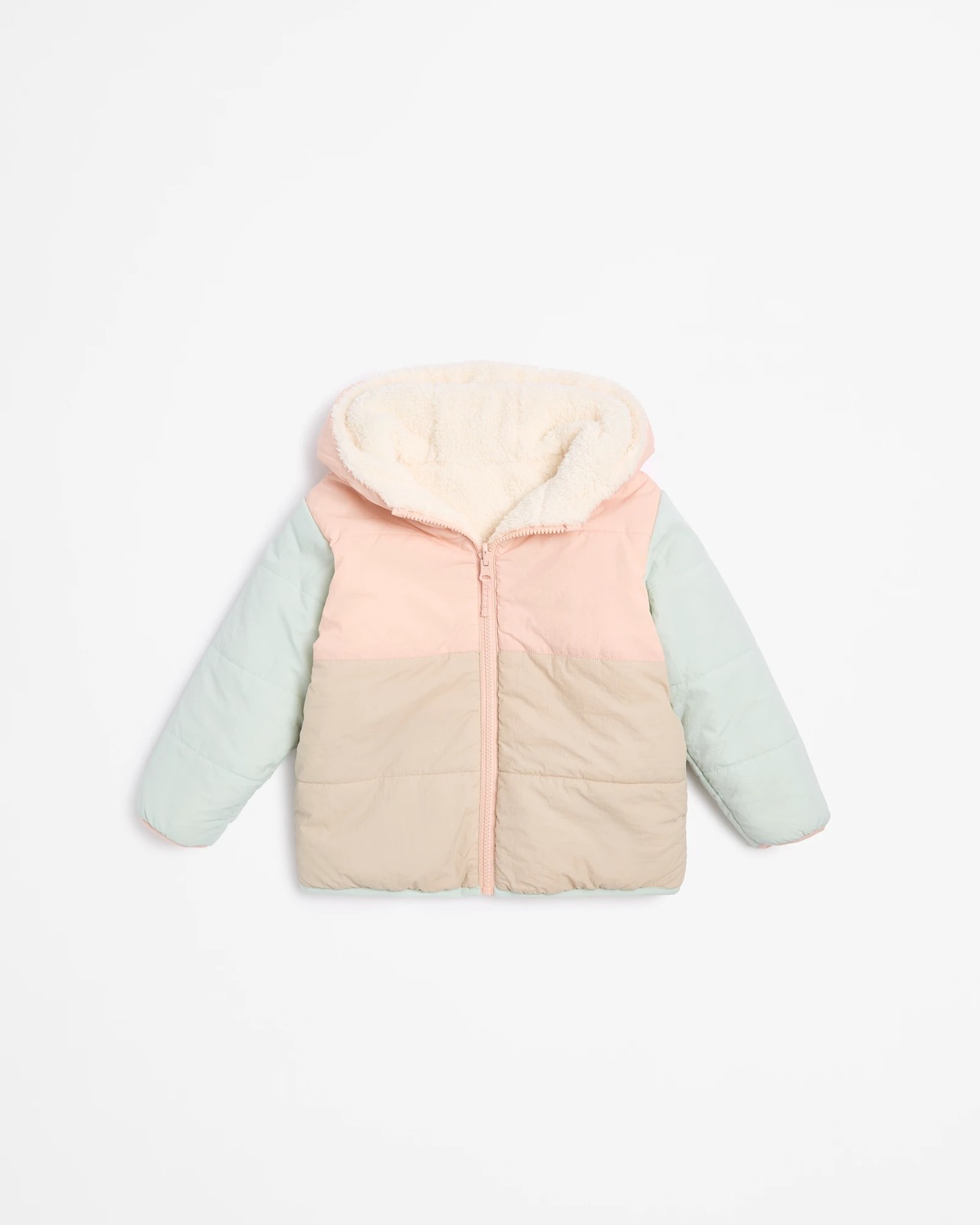 The Reversible Colour Block Puffer Jacket for girls offers fantastic versatility and style. Whether they're heading to school or out for a weekend adventure, this jacket provides a cosy, warm embrace with its sherpa fleece lining on one side and a trendy colour-block pattern on the other. The zip front with side seam pockets ensures practicality and easy access to essentials, while the hood and long sleeves with elastic cuffs keep the chill at bay. The elastic hem adds a snug fit, making it perfect for active young ones. Experience the dual joy of fashion and comfort in one stylish jacket. Don't miss out, grab this essential winter wear today!