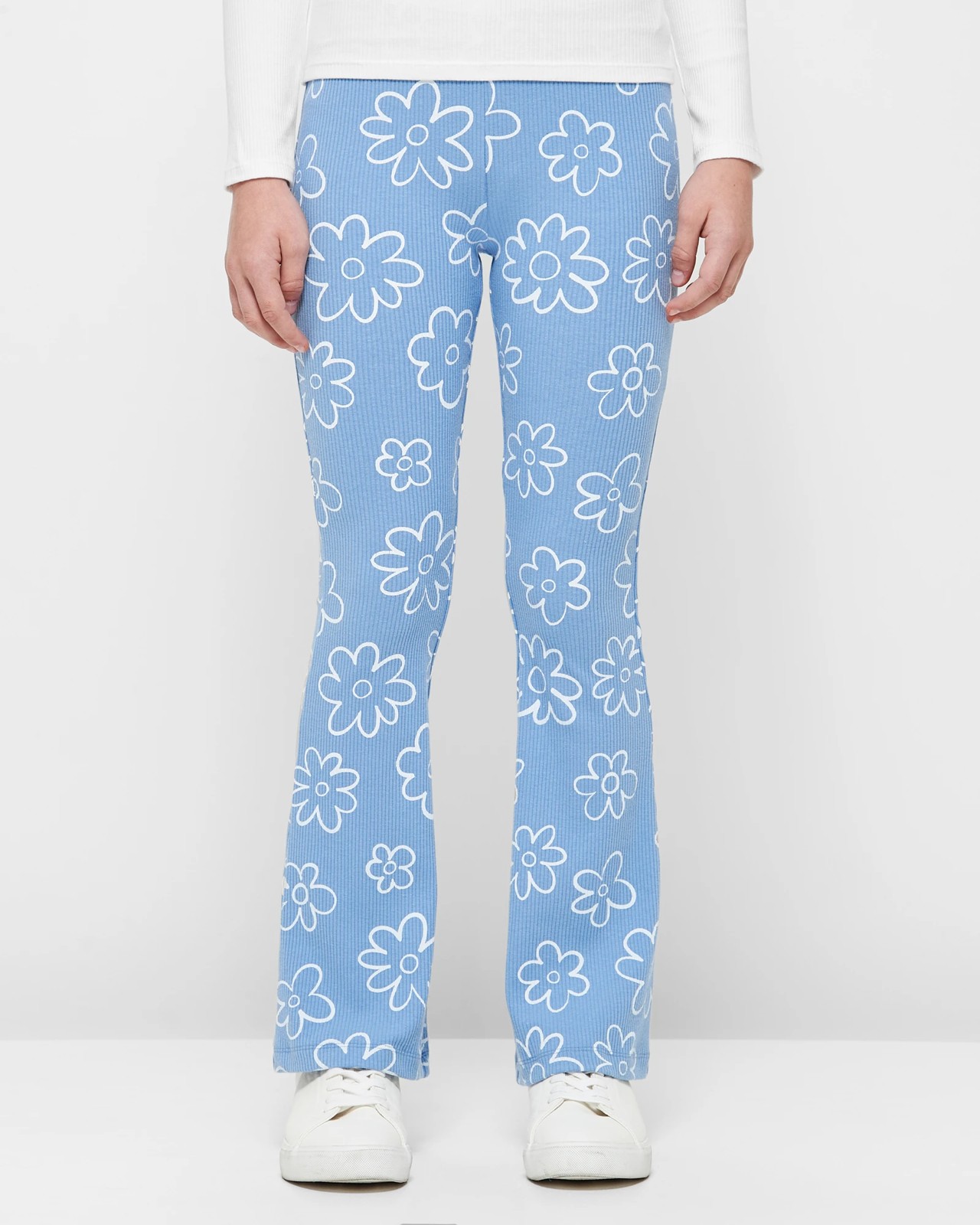 Rib Flared Daisy Leggings. Step into comfort and style with our Rib Flared Daisy Leggings. Made from a cotton-rich fabric with a touch of stretch, these leggings feature a charming all-over daisy print in lovely blue. The wide elastic waistband ensures a snug fit, while the full-length flare adds a playful touch. Perfect for pairing with a cosy jumper or a stylish top, they are ideal for any occasion. Treat yourself to these fashionable yet comfortable leggings today!