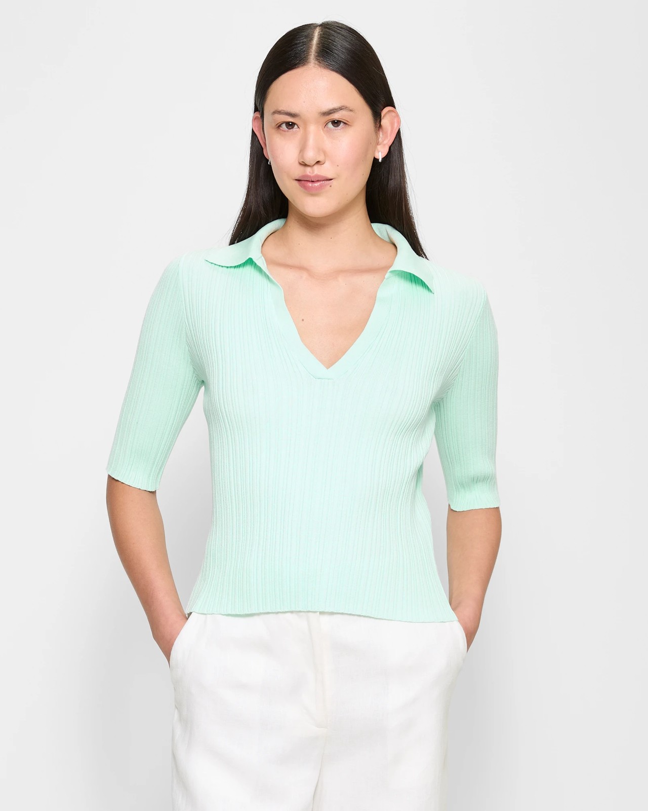 Experience effortless elegance with our Rib Notch Collar Neck Knitted Top by Preview. Crafted from a premium blend of viscose and nylon, featuring LENZING™ ECOVERO™ viscose fib-res for a luxurious feel. The slim fit and ribbed knit design add a touch of sophistication. The round collared neckline with a stylish front v-drop complements the short sleeves perfectly. Embrace timeless style with every wear. Elevate your wardrobe today!