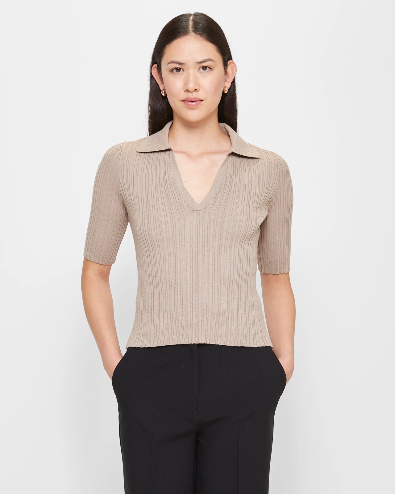 Experience effortless elegance with our Rib Notch Collar Neck Knitted Top by Preview. Crafted from a premium blend of viscose and nylon, featuring LENZING™ ECOVERO™ viscose fib-res for a luxurious feel. The slim fit and ribbed knit design add a touch of sophistication. The round collared neckline with a stylish front v-drop complements the short sleeves perfectly. Embrace timeless style with every wear. Elevate your wardrobe today!