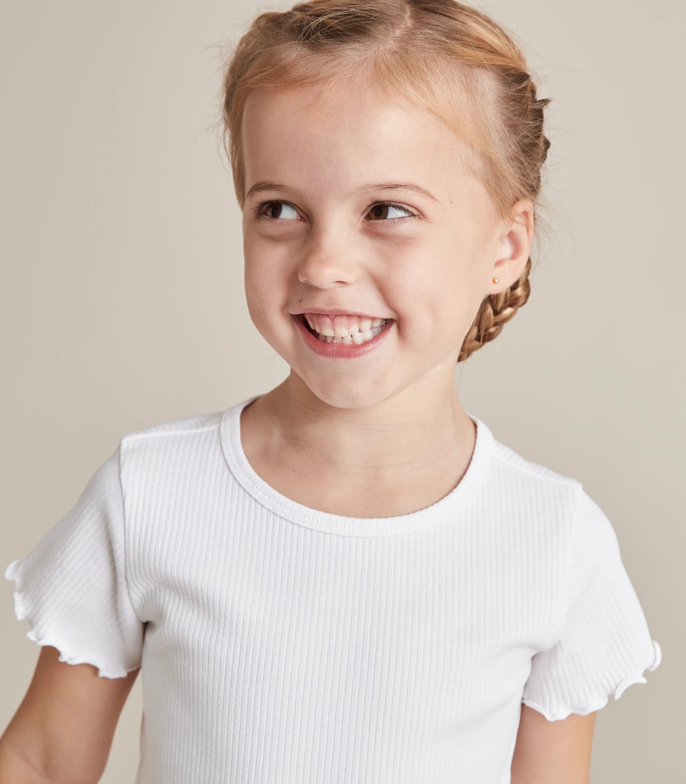 Introduce a fashionable and fun look to her wardrobe with the Girls Rib T-shirt from Target! This comfy top is crafted from a cotton-rich blend, giving it a soft and stretchy feel. Featuring a classic crew neckline and cap sleeves with lettuce cuffs and hemline, this ribbed t-shirt is sure to become her go-to for any occasion. Show off her unique style with the Girls Rib T-shirt from Target!