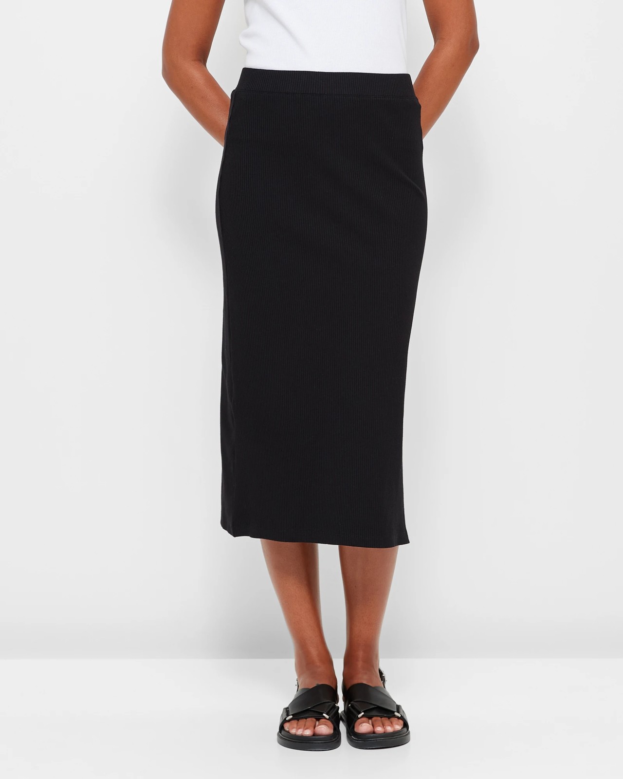 Introducing our Ribbed Skirt, crafted from a comfortable cotton/polyester blend fabric with added stretch for a perfect fit. This versatile skirt features an all over ribbed design that adds texture and style to any outfit. The regular fit and flat elastic waistband ensure maximum comfort without compromising on style. The pencil cut and midi length create a flattering silhouette, while the straight hemline adds a touch of elegance. Finished with a side seam split for added movement, this skirt is a must-have for any wardrobe. Complete your look with this chic black Ribbed Skirt and experience the perfect combination of comfort and style. Upgrade your wardrobe today!
