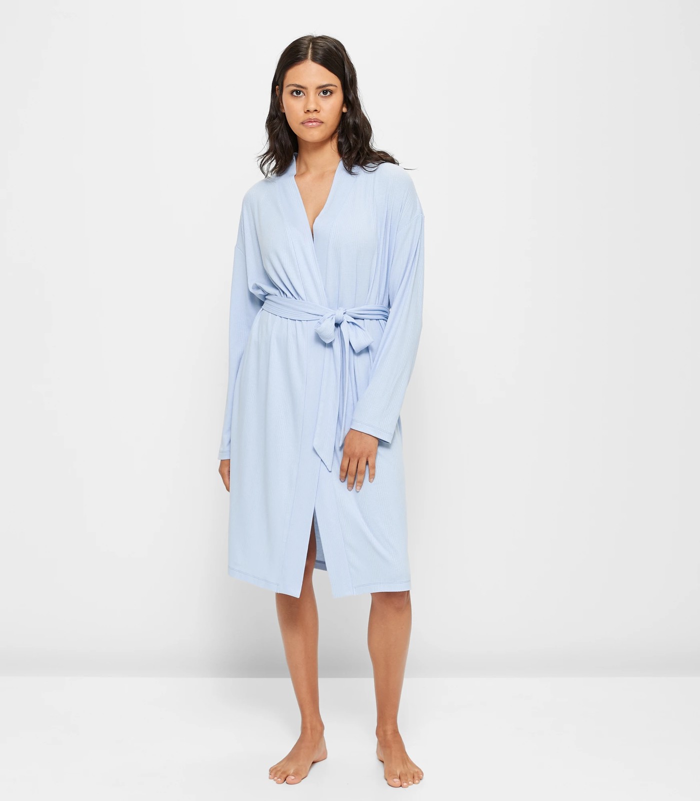 Make yourself comfortable as you get ready for bed in the ribbed sleep robe. Crafted from a polyester/viscose blended materials with an all over ribbed look, it also has stretch to help keep you comfortable. The long sleeve design will help to keep you covered in the warmer weather and it also features an open front for easy pull on and a removable tie waist belt to cover you up. A must have for the summer season - pair it with the matching bottoms and top to complete your sleep look (sold separately).
