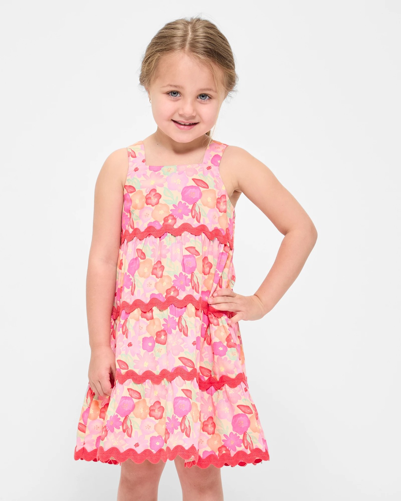 Transform your little one's wardrobe with the charming Ric Rac Dress. Perfect for any occasion, this delightful dress features a vibrant red floral print that stands out beautifully. Its wide shoulder straps and square neckline deliver both comfort and style, while the ric rac tiered trim adds a playful touch. The regular slip-on fit and shirred elastic back bodice ensure ease of wear, making it a favourite for active days. Treat your child to this adorable A-line dress and watch their eyes light up with joy.