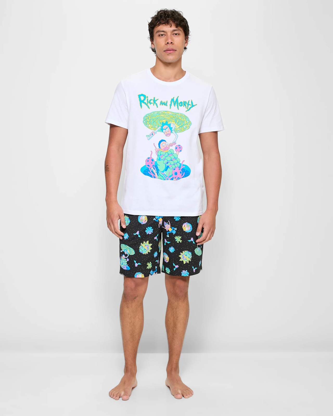 Shorts: black colour, all over Rick & Morty™ print, elastic waist with drawstring, side seam pockets, short leg length, straight hemline