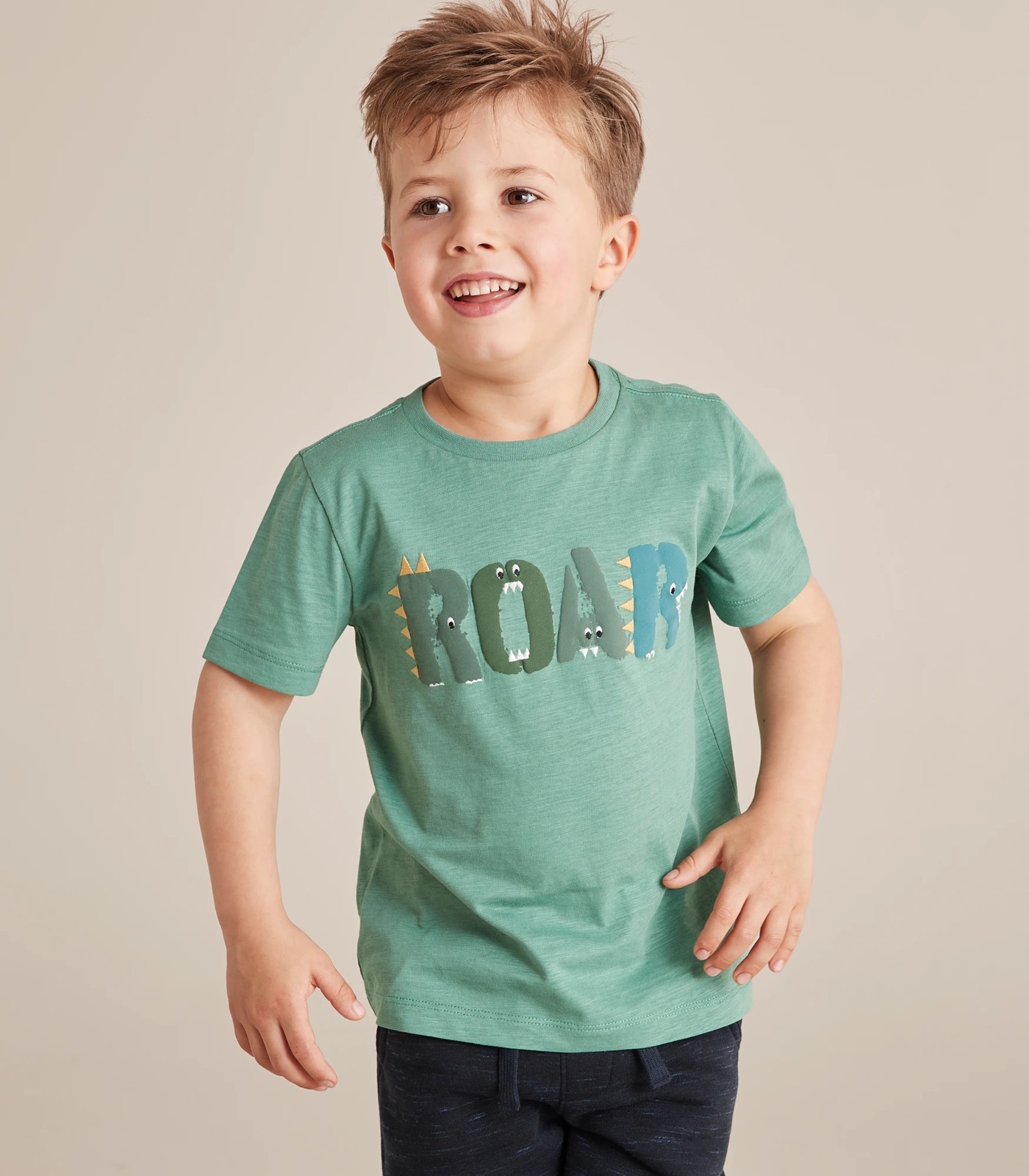 A great roaring addition to his wardrobe comes the green Roar Graphic Print T-shirt, featuring a ribbed crew neckline, short sleeves and is crafted from soft cotton for all day comfort.