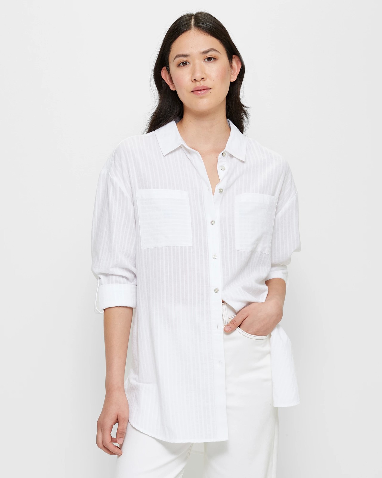 Introducing our Roll Cuff Pocket Shirt, a must-have addition to any woman's wardrobe. Made from a comfortable cotton fabrication, this shirt features an all-over textured material that adds a subtle touch of elegance. Its regular fit and round collared neckline offer a classic and timeless look. With long roll cuffed sleeves and open double chest pockets, this shirt combines style with functionality. The curved hemline and long length make it versatile to wear as a standalone piece or layer with other items. Upgrade your style game and indulge yourself with this exquisite shirt. Click the link below to make it yours today!
